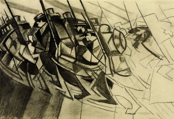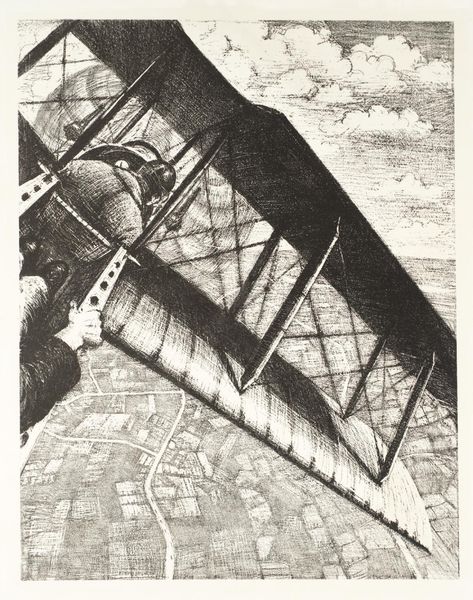 Editor: So, this etching from 1946 is called "And Sun Throws Shadows," created by Richard Florsheim. I'm immediately drawn to the stark contrasts and almost unsettling perspective; it makes me feel slightly disoriented. What do you see in this piece? Curator: Disorientation is a good starting point. Think about the period – 1946, just after the Second World War. There's a lot of social and cultural upheaval, a sense of unease that artists were grappling with. What seems to be a cityscape is rendered almost abstract. Do you see the towering structures becoming almost oppressive shapes? Editor: I do. They loom over everything, especially those dark, ambiguous objects in the foreground. What could those be? And what is the significance of showing it in monochrome, is there something he wanted to highlight? Curator: Exactly. The monochrome is key. It flattens the space, adding to that feeling of unease. In a post-war context, we might see this as a critique of industrialization and urbanization, the way these forces are reshaping our environment. The objects could be figures, distorted and minimized by the scale of the city. What does that say about the individual's place in the world? Florsheim’s artistic production and visibility occurred in this very tumultuous period; as an historian I see the significance in artworks that provide commentary on political climates or on important social structures such as urbanization. Editor: So it's not just a literal depiction of a city, but a commentary on the individual's place within a rapidly changing society? Curator: Precisely. And who has access to producing this commentary? Who decides what “art” gets displayed and valued? The work prompts these important questions, especially in a museum setting. Editor: That's fascinating; I initially just saw it as an interesting composition, but the historical context adds a whole other layer of meaning. I didn't think of how political it could be to just portray urban life in this way. Curator: Right? Considering the historical period helps you understand and appreciate what this artists work communicates about that moment, beyond what may first strike you about it.