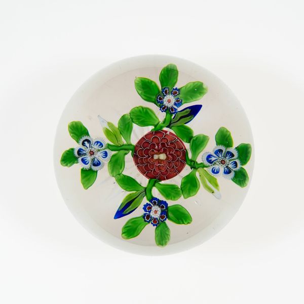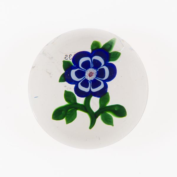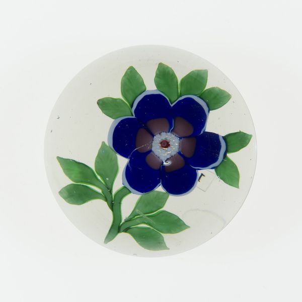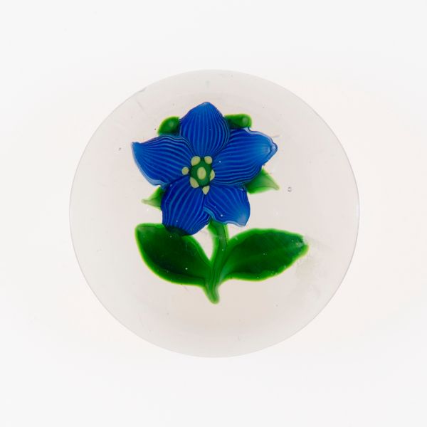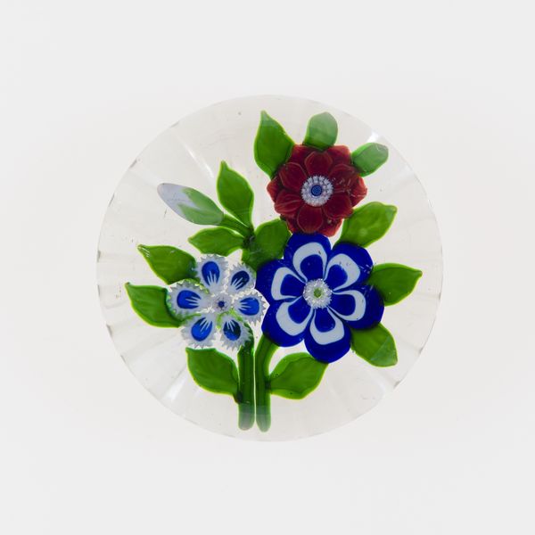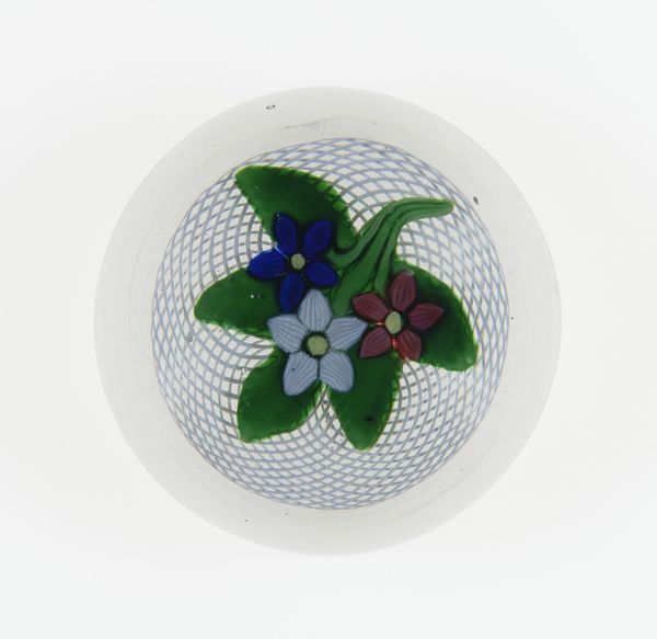 Editor: We’re looking at a glass paperweight by Baccarat Glassworks, dating to between 1848 and 1855. I find the encased flowers to be a very intimate scene, sealed off and preserved by the glass. What do you see in this piece? Curator: The floral arrangement arrests the eye. Note the geometrical perfection; each flower's petals are uniform. Consider the luminosity—how the clear glass distorts the tones and saturations of each bloom. It creates a microcosm of controlled beauty. Editor: Do you think that sense of control speaks to the artistic intentions here? Curator: Precisely. Every facet, every bubble is deliberately placed. The artist's formal arrangement echoes a desire to capture and present nature in a manner exceeding its chaotic reality. Consider the lack of depth. This suggests that the art is an engagement of flatness versus the reality each element signifies, which the eye struggles to unify. What do you make of that? Editor: So, it's less about representing flowers accurately and more about exploring what glass and carefully arranged forms can do? That hadn't occurred to me, actually. Curator: Exactly. The beauty emerges not just from subject matter, but from material exploration and visual structure. It's about observing formal composition as language in itself. Editor: It’s like a captured, idealized moment, but one where the artistic intent is in the tension and structure rather than simply pretty replication. I'll have to consider that more often.