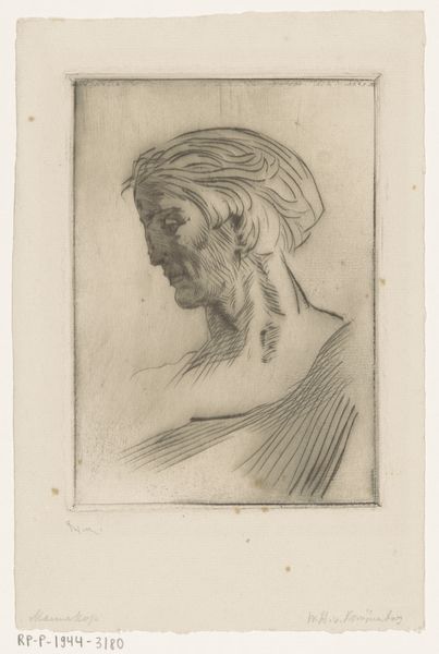Editor: Here we have Alphonse Legros' "Head of a Man," created in 1877, using graphite and etching. There’s such an elegant simplicity to it. I’m curious about how Legros constructed form with what seems like so few lines. What do you see in this piece? Curator: Indeed. Note how the artist, through the deft manipulation of line and value, has crafted not just a likeness but an evocative study in form. Observe, for example, the strategic deployment of hatching and cross-hatching. Where does Legros apply the densest concentration of line? Editor: It looks like the darkest areas are around the jawline and the side of the nose, really defining those features and creating shadows. Curator: Precisely. And what effect does this localized darkness achieve when juxtaposed with the relatively bare expanse of the paper surrounding the figure? We must recognize the strategic tension here between presence and absence. Editor: It brings the subject forward, highlighting his face. It's a very economical, almost sparse composition, letting the technique speak for itself. The man’s gaze is very contemplative. Is that intentional, do you think? Curator: Contemplation is a fitting description. While intentionality remains a matter of conjecture, it's clear Legros harnesses the very syntax of representation – line, tone, composition – to elicit an introspective mood. His structural means allow Legros to suggest emotion without prescribing it. Editor: I hadn't considered how much the visual choices contribute to that feeling. Now I see how he leads the eye. Curator: Absolutely, every choice creates a new structural relationship, impacting how the work is ultimately viewed and interpreted. A fascinating study, indeed.