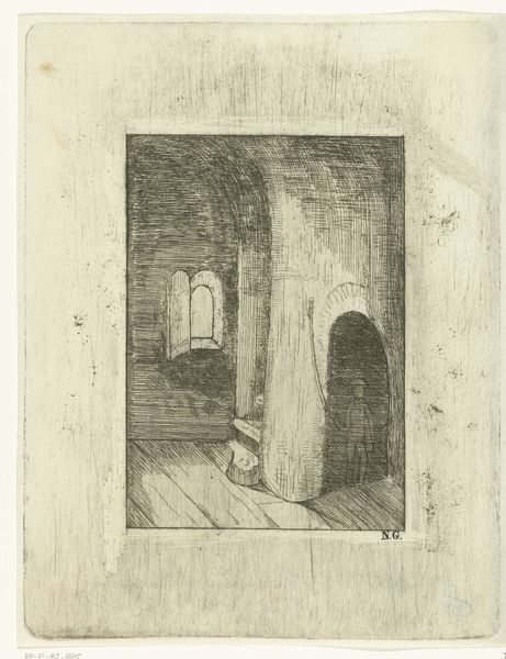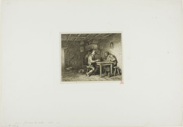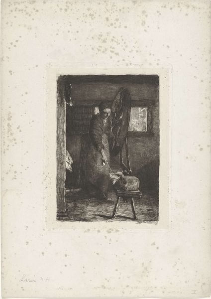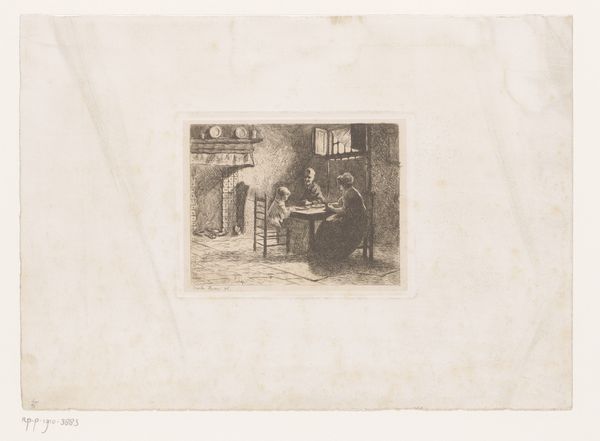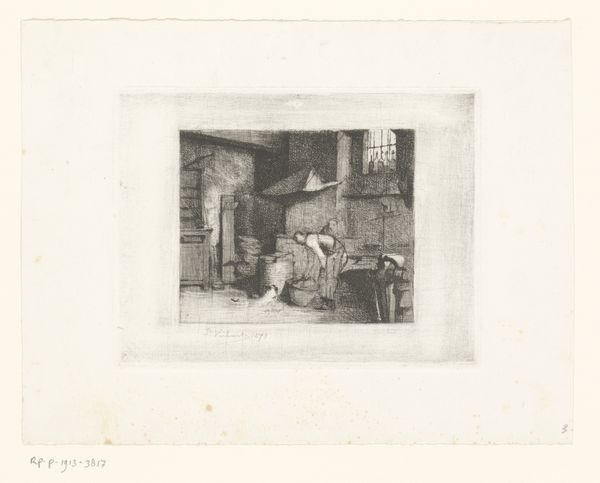 Editor: This is Bror Julius Olsson Nordfeldt's "Coppersmith," made in 1916. It’s an etching, and there's a remarkable sense of enclosed space in this intimate interior scene. What’s your take on it? Curator: What interests me most is how Nordfeldt presents labor. Etchings like this often romanticize pre-industrial crafts, creating a nostalgic vision of work before mass production, but what statement might he be making about artistic production? Editor: That's an interesting point. How does presenting craftspeople as subjects affect the consumption of art in this period? Is there some connection with, for instance, socialist values? Curator: Absolutely! Consider the Arts and Crafts movement. Nordfeldt might be subtly aligning artistic labor with other forms of skilled work, elevating its status within a changing society. Also, remember who can *afford* art. He sold work to patrons and institutions whose politics ran the spectrum of his moment in history. Can one image make these sorts of sweeping gestures that apply to everybody? Or does it subtly shift perception in specific cultural ecosystems? Editor: So, even while romanticizing a simpler time, these images potentially negotiate the role of the artist within contemporary social structures. That's definitely something I hadn't considered. Curator: Exactly. The art market creates narratives around creation as well as creativity; the images become actors. These works are visual arguments participating in a broader cultural discourse about value, work, and identity. Editor: It’s really helpful to think of it that way—art as actively participating in these social arguments. I will try to use that going forward. Curator: That's my aim! Understanding art is never simply admiring its aesthetic qualities.