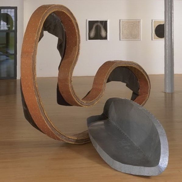 Deacon was one of the leading British sculptors to emerge in the 1980s. The sweeping curves of his large-scale works often suggest organic forms. At the same time, many of Deacon's sculptures draw attention to their process of manufacture and use of urban and industrial materials. In this work, the laminated hardboard edges and carefully riveted surfaces contrast with the fringe-like shapelessness of the canvas. Gallery label, August 2004