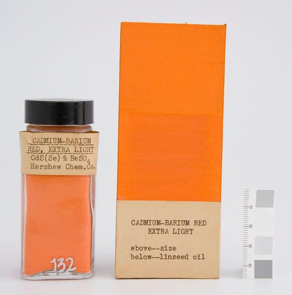 Editor: Here we have Cadmium-Barium Red, Deep manufactured by The Harshaw Chemical Company. It's striking how the pigment’s raw form contrasts with its application. How should we approach interpreting this? Curator: Consider the materiality. The Harshaw Chemical Company was a key player in industrial pigment production. This sample highlights the transition of raw materials into commodities. How does this blurring of art and industry challenge traditional artistic notions? Editor: So, it's less about the aesthetic and more about the pigment's journey from factory to artist's palette? Curator: Precisely! It prompts us to think about labor, consumption, and the social context surrounding artistic creation. It makes us rethink the role of the artist, doesn’t it? Editor: I see. I hadn't considered how much the industrial process impacts artistic expression. Thanks! Curator: It's a vital aspect. Understanding these elements enriches our perspective.