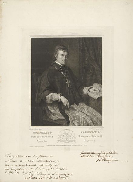 Curator: Today we are observing Henricus Wilhelmus Couwenberg’s 1837 engraving, "Portret van Cornelius Ludovicus baron van Wijkerslooth bisschop van Curium," here at the Rijksmuseum. Editor: My first impression is one of quiet dignity. The contrast between light and shadow gives a solemn weight to the Bishop's figure, drawing focus to his face. Curator: Precisely. Note the meticulous use of line to delineate form, a hallmark of academic art, particularly within portraiture of this era. The subtle gradation of tones creates volume and texture, enhancing the subject's presence. Editor: I find myself drawn to the lace detailing—a delicate counterpoint to the severe expression. It speaks volumes about wealth and status, integral to the Bishop's role and the power structure of the time. Curator: An astute observation. Lace becomes a signifier of the Bishop's station, imbuing the piece with a layer of semiotic complexity. Moreover, the very act of creating a print like this makes it accessible beyond the Bishop’s immediate circle, furthering his image as a leader within society. Editor: Consider the backdrop too—the subtle hint of drapery suggests both the opulence of his surroundings and perhaps, the theater inherent in religious leadership. How conscious do you think Couwenberg was of constructing an image of authority? Curator: Unquestionably deliberate. Through precise engraving techniques, the artist shapes our understanding of this historical figure. From the ornate crucifix to the posture, Couwenberg orchestrates a narrative of piety and power—very much in keeping with Romanticism's engagement with history. Editor: It certainly gives one much to consider about the intersection of faith, image-making, and societal standing within 19th-century Dutch culture. The close examination allows for many lines of enquiry. Curator: Indeed, considering the intrinsic pictorial elements alongside the socio-cultural environment opens rich avenues for exploration and insight into both the artwork and its epoch.