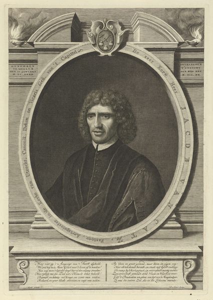 Curator: This is Antoine Masson's "Portret van Louis Henri de Pardaillan de Gondrin" created in 1673, an engraving rendering of a well-known public figure from the Baroque period. Editor: My first thought? Powerful, but surprisingly… vulnerable. There's an undeniable authority emanating from the subject's pose and attire, but also a fragility in the eyes. Curator: Masson was known for capturing the essence of status through codified visual markers. Note the meticulous details in the clerical collar and the cross pendant, the garments acting almost as a visual shorthand for religious rank and unquestionable power. These are symbols meant to project dominance and connection to God. Editor: Exactly. And power in this era was all about maintaining social control. The symbols chosen here weren't simply decorative, they were strategic tools in shaping identity and maintaining the established order. Who gets to decide what power looks like, and who benefits from that definition? Curator: The tight focus on the figure forces the viewer into an intimate confrontation with his presence. It's hard to look away from his eyes or those somewhat chaotic curls, almost as though Masson is using the soft, almost tender rendering of these elements to subvert the rigid formality that defined Baroque portraiture, introducing instead an almost human, frail characteristic. Editor: I wonder, then, if this supposed "frailty" is another calculated manipulation. Portraits were powerful tools, shaping the subject’s legacy. Is Masson subtly critiquing or subtly propping up this man's power? Who commissioned this engraving, and what purpose did it serve in furthering their agenda? Curator: The text and heraldic devices along the bottom edge of the work suggest its formal and propagandistic intention. One is confronted not with a personality so much as with an image crafted to ensure recognition and respect through conventional markers of authority. The engraver carefully layers each symbol and line, composing an allegorical elevation of Louis Henri. Editor: Right. And understanding who is elevated, and how, gives us a clearer lens onto the values—and the inequalities—of that time. A fascinating snapshot, layered with carefully constructed meaning. Curator: A compelling and beautifully executed rendering of status. Editor: A pointed commentary on power, carefully disguised as portraiture.