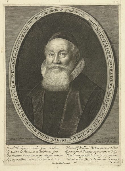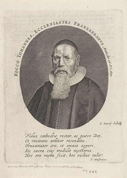 Curator: Today we are observing Steven van Lamsweerde's "Portret van Abdias Widmarius," an engraving from 1654. What strikes you first about it? Editor: The most notable aspect to me is the sitter's intense gaze and magnificent beard, creating an overall impression of steadfastness, wisdom, and authority—qualities we can associate with religious and political power in 17th-century Holland. The lines of the print enhance the portrait's stern gravitas, I find. Curator: Indeed, Van Lamsweerde's employment of line engraving is particularly sophisticated, layering meticulously etched lines to generate shading, depth, and a remarkable textural richness, especially in the rendering of Widmarius's voluminous beard and the intricate folds of his attire. See the Latin text encircling his likeness, functioning as both frame and intellectual context for this learned man. Editor: That frame reminds us that portraits such as these often served purposes beyond simple likeness, particularly regarding societal power and recognition. Widmarius's role is noted on the etching—pastor of churches in multiple territories including Gelderland, Groningen, and Friesland. This suggests a sphere of profound spiritual and perhaps even political influence during a pivotal era. It’s interesting to reflect on how his physical appearance deliberately evokes notions of religious figures and intellectual distinction in the public sphere. Curator: Notice also how the composition balances textual and visual elements, employing contrasting forms such as straight and curved lines to harmonize what might otherwise compete for our focus. Van Lamsweerde has managed to imbue the print with an enduring aesthetic equilibrium. Editor: This balance mirrors the dual life suggested in the epitaph text, one of exilic movement “Bolga, Lyceo” that transitions into rooted, pious inhabitance of sacred knowledge: “mentem sapientid adornat." So the visual is not separate, but acts as a complement to this life story—making it quite dynamic. Curator: An incisive perspective that broadens how we consider this remarkable print. Editor: Yes, it reveals not only the power of carefully wielded lines, but the complex role of portraiture in constructing historical identities and preserving social hierarchies.
