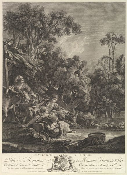 Curator: What a captivating tableau. We're standing before François Boucher's "Shepherd's Idyll," completed in 1768. It exemplifies the Rococo style with its soft colors, idyllic themes, and celebration of pastoral life. Editor: It does seem quite lighthearted. My initial reaction is one of tranquility; the overall composition, the figures grouped informally, suggests a world free of strife, doesn't it? Curator: Yes, but let’s delve a bit deeper. Boucher was a favorite of the French court, and his depictions of rural life, while seemingly innocent, often functioned as fantasies, far removed from the reality experienced by the peasantry at the time. The painting certainly caters to the elite, portraying shepherds and shepherdesses in a manner that's more akin to leisurely aristocrats. It also contributes to a larger pattern of misrepresenting realities in artwork. Editor: I see what you mean. Though when considering the visual language, it's hard not to notice Boucher's masterful rendering of light and shadow. He captures a luminous atmosphere; notice the textures, the gentle curves in the bodies and landscapes. How is this accomplished in such an artful manner? Curator: Consider the positioning. The arrangement of figures is a spectacle of artifice. It also speaks volumes about social hierarchy and gender roles during that period. This highlights issues in terms of equity. Editor: Absolutely. And looking closer I observe a symbolic connection to the natural world through careful observation of compositional harmony, for instance through color use. Boucher uses muted tones of pastel, which evoke sensations of tranquility. Curator: Rococo as a style presents many contradictions. Its superficial charm conceals and sometimes reinforces power imbalances, gender norms and the romanticizing of a harsh pastoral way of life. It represents just how complex even the most aesthetically pleasing pieces of art can be! Editor: Indeed. A harmonious visual construction combined with complicated narrative elements is not rare at all. By focusing on both social commentary and aesthetics, we uncover layers within "Shepherd's Idyll."