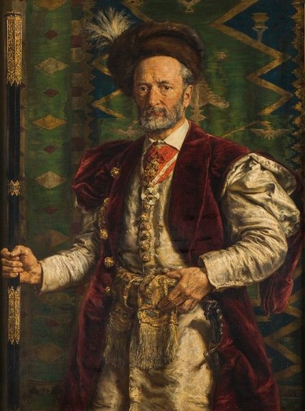 Curator: This is Rembrandt van Rijn’s "A Polish Nobleman," painted in 1637. Editor: Well, he certainly has presence. The fur looks so heavy, and I'm immediately drawn to the cane—the hand grasping it seems almost… worn. It's the detail of the gold filigree that makes it all work, though. Curator: Indeed. It is thought this piece exemplifies Rembrandt's interest in exoticism and the performance of identity. He wasn't literally painting a Polish nobleman; rather, he was engaging with the image of Polish nobility circulating in Dutch society at the time. Editor: So it’s more of a commentary on how Dutch society viewed Polish aristocracy rather than an actual portrayal? Did Rembrandt ever travel to Poland, and if not, what sources would he have been referencing? I am thinking about what those textural translations might suggest, too; fur, after all, wasn’t just for show – its quality spoke volumes about wealth and status. Curator: Exactly! Rembrandt, as far as we know, never went to Poland. He likely drew inspiration from costume books, travelers' accounts, and possibly even Polish visitors to Amsterdam. Remember Amsterdam was a bustling hub of international trade and culture in the 17th century. This means Rembrandt probably saw actual materials and fabrics similar to those in the painting and found Polish cultural referents very "marketable." Editor: That makes me wonder about the labor involved in creating the nobleman’s garments. The gold chain and fur trimming alone probably occupied a skilled artisan for weeks! Is there anything to tell us about whether the economic power related to the nobleman depicted really mattered or just its simulacrum in Holland? Curator: The display of opulence absolutely mattered. It’s worth mentioning Rembrandt likely owned a vast collection of costumes and props, reflecting an investment in this "performative" aspect of portraiture. The studio became a stage for exploring the power of representation itself, and wealth here gets conflated and confused with political or cultural "influence." Editor: So in some sense, Rembrandt was an early practitioner of… cosplay? By creating such accurate depictions with expensive fabrics that were considered trophies, was Rembrandt playing into the capitalist and trading values of Dutch society? It sounds as though this painting's value might not have so much to do with portraiture as a process, but that there was some social messaging happening. Curator: Absolutely. By dressing his model in these exaggerated materials, Rembrandt cleverly engaged with ideas about class and otherness in Dutch culture. And, perhaps unsurprisingly, did very well in sales and securing patrons. Editor: It's a fascinating glimpse into how art can both reflect and shape perceptions. A master class on how materialism manifests within the historical canon. Curator: A lens through which to understand the intertwined nature of history, representation, and artistic creation.