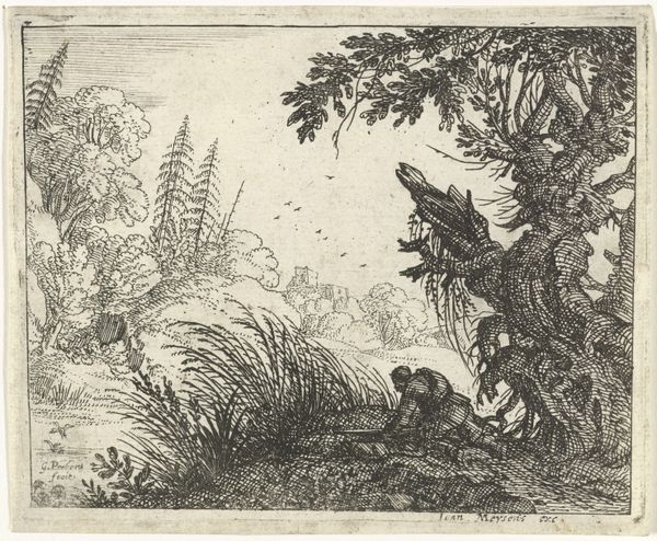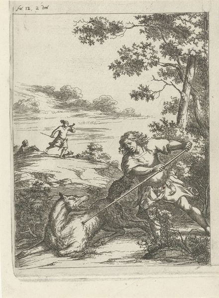 Curator: This is "Fable of the Dog and the Vulture" by Simon Fokke, created in 1769. It’s an engraving, ink and graphite drawing, part of the Rijksmuseum collection. Editor: Immediately, there's a delicate brutality to it, isn't there? The fine lines contrast sharply with the harshness of the scene—the dog seems to be protecting its meal from the descending vulture. Curator: Precisely. Fokke was working within a period where moralizing fables were a popular subject in art. This image speaks to the themes of greed and the struggle for survival prevalent during that time. We can understand that public reception would have engaged with it on a pedagogical level. Editor: The composition guides our eye masterfully. Notice the subtle play of light and shadow, achieved through varied line weight. See how the artist contrasts the detail in the foreground elements with the looser hatching suggesting atmospheric perspective. This visual technique adds depth. Curator: The engraving was likely disseminated widely through prints. Such affordable artworks brought visual narratives into middle-class homes, embedding them into public consciousness. Editor: I see a landscape in the distance – perhaps a port or city that’s reduced by the diminutive scale of the work itself. The landscape and the composition as a whole are organized in relation to one another, each serving an indispensable narrative role, no? Curator: Absolutely. And the animal allegory – quite common! – made the complex socio-economic realities accessible, shaping perceptions of avarice and justice. Editor: This work seems a fascinating example of semiotic representation where line, form, and scale work harmoniously, but it also presents a harsh lesson about power dynamics. Curator: It reminds us how images like these played an essential role in constructing social norms, beliefs, and ethics within society at the time. Editor: Indeed. Even through its modest size and refined execution, the artist successfully communicated about greed and survival.