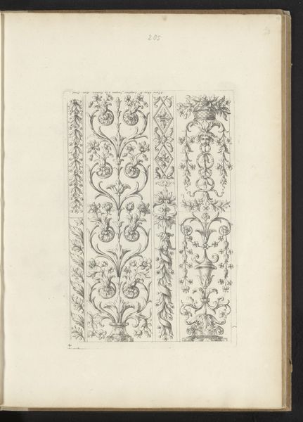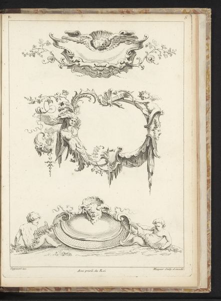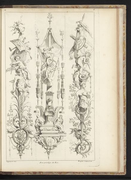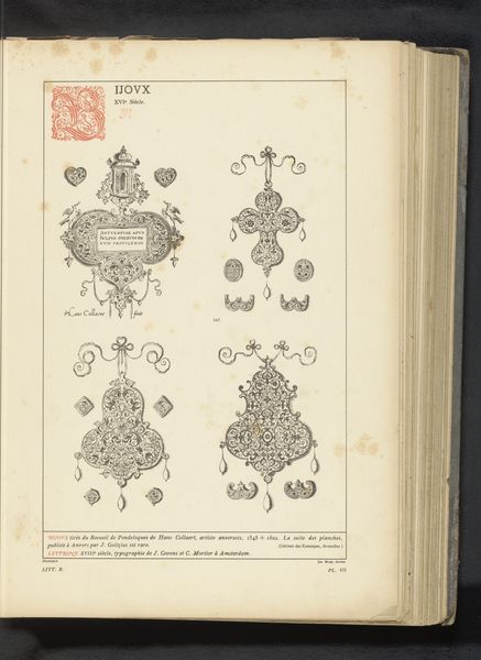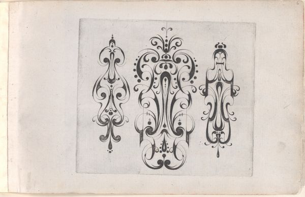 Curator: This work is titled “Reproductie van drie prenten van juwelen door Daniel Mignot," meaning "Reproduction of three prints of jewels by Daniel Mignot." Dating to before 1880, these engravings showcase jewelry designs from an earlier era, likely the Baroque period. Editor: Immediately, I notice the ornate and rather fantastical character of the compositions. There’s a playful quality to the linework and the strange hybrid creatures supporting what appear to be miniature human figures. It’s as if we are viewing imagined ornaments and jewels. Curator: Yes, Mignot was quite active in illustrating extravagant jewelry, which, beyond its monetary worth, functioned as visible markers of class and status. In the baroque period especially, these embellishments mirrored a culture saturated with overt display of power. Editor: The structural arrangement here is interesting. The use of flowing lines contrasting with intricate details suggests the semiotic interplay between freedom and restriction that would have been considered aesthetically ideal in this era. Observe also how these curving lines guide our eye. Curator: Considering that this is a later reproduction of earlier works, we must also contemplate issues surrounding artistic agency and reinterpretation. How do the values and intentions of the engraver of the reproduction interact with the ideas of Mignot? Are we losing or gaining something across this temporal and cultural gap? Editor: It is worth pondering how these designs served as an early form of what we could today recognize as advertisement or promotion. By producing these images, Mignot played a critical role in constructing desire. Curator: Indeed. He not only designed jewels, but in a way helped design the very aspirational framework connected with the wearing of these status objects. It is the symbolic representation of self. This piece really invites considerations around not only artistic value, but social worth as well. Editor: By paying attention to the intricacies and historical context of artworks, we may discover unexpected parallels between past and present as well. Curator: Absolutely. Reflecting on historical ideas is crucial for thinking more thoroughly about contemporary culture and challenging preconceptions of ornamentation and class.
