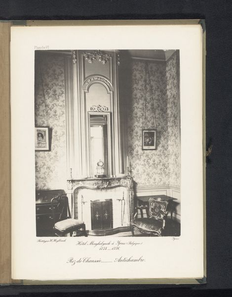 Curator: Today, we’re examining an etching from before 1894 by Hector Heylbroeck, titled “Eerste salon op de begane grond van Hotel Merghelynck in Ieper, België,” or "First salon on the ground floor of Hotel Merghelynck in Ypres, Belgium.” Editor: The overwhelming impression I get is of fragile opulence, a sort of faded glory rendered in very precise detail. The symmetry feels both comforting and a little rigid. Curator: Indeed. The architectural rendering is quite exact. The lines of the paneling and furniture exhibit the visual rhetoric of Realism. The drawing meticulously captures the ornamentation and the play of light across surfaces, though the material is "merely" paper. Editor: The garlands of flowers cascading down the walls strike me as significant. They speak to cycles of life and decay, perhaps alluding to the transient nature of the wealthy occupants who would have used this space. Flowers and gardens were central symbols of regeneration and hope, yet so fleeting, in pre-industrial culture. Curator: Semiotically speaking, you could read the garlands as decorative elements reinforcing the social standing of the inhabitants through association with nature's abundance, a carefully constructed facade if you will. Editor: A facade perhaps built on inherited wealth? I wonder if there are hidden messages embedded within the visual program of the interior: certain flowers referencing familial heraldry, architectural cues nodding towards specific ancestral narratives. This level of decoration also suggests something of the personalities that had the space designed this way, no? Curator: The balanced composition, particularly the mirroring of floral arrangements and wall decorations, points towards a highly formalized societal structure where symbolic display reinforced social hierarchy. However, without additional context it’s difficult to speculate regarding narrative depth or overt symbolism, beyond displays of upper-class taste. Editor: Perhaps so, but I’m drawn to consider the echoes that remain. Despite the rigid form, I can almost feel the space buzzing with the unseen interactions of the people it housed, the ghosts of human events. I can't help but wonder who enjoyed it, and who suffered there as well. Curator: An understandable perspective. For me, I value that Heylbroeck captured this constructed domesticity with formal accuracy that offers us invaluable insights into how that society wanted to project itself.