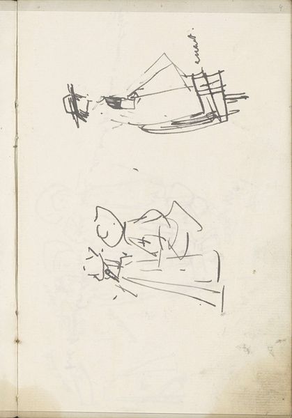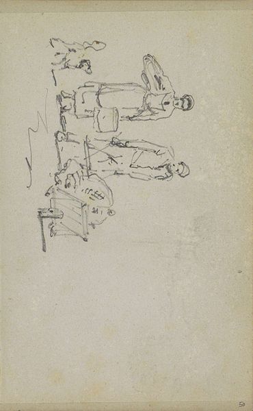 Curator: Here we have George Hendrik Breitner's pencil drawing, "Girl Next to a Child in a High Chair," likely created between 1881 and 1883. Editor: It's remarkably spare. Raw even. The figures barely emerge from the page; an impression, almost ephemeral, of a domestic scene. Curator: Breitner was very interested in portraying modern life. One might consider what this sketch reveals about his observation of the domestic labor and caretaking often relegated to women and the household structure during this period. He captures a private moment, a vignette of childcare through the filter of class. Editor: The lack of detail lends a certain universality, though. Focusing on form; note the contrast in the handling of line—the child’s head rendered with heavier, almost frantic scribbles versus the tentative, longer strokes suggesting the girl’s form and the high chair. It builds a compositional tension between presence and absence, seen and unseen. Curator: We can connect Breitner's material choices with the realities of artistic production at that time. Pencil drawings like these, perhaps studies for larger works, reveal his access to affordable materials and the role of drawing as a crucial step for academic painting. Consider who could afford models, and for whom. Editor: Absolutely. There’s an incompleteness that speaks volumes. Look at how the girl fades into the background, almost part of the chair itself. It's stark, almost emotionally distancing despite the tenderness implied by the scene. He used the medium and that specific lack of refinement to say something beyond a representational approach. Curator: By considering the labor and material circumstances, it adds dimensions of interpretation beyond mere aesthetics. The means of production themselves reflect something meaningful about the artistic and social context in which he worked. Editor: Ultimately, both process and presence give power to what remains unsaid and unseen, providing entry points into something quite profound, whether we consider the means through which that presence came to be, or simply the structural decisions that shaped it.