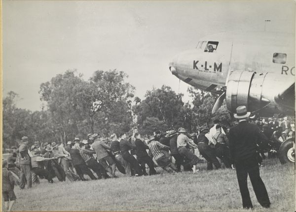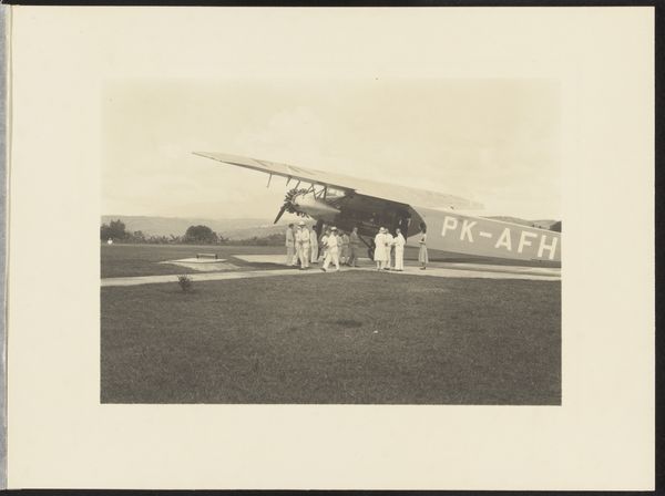 Curator: Here we have a gelatin-silver print by Otto Hisgen, dating from 1931 to 1935, titled "Departure of the Delegation of Governor A.H. Neijs after the Visit to the Pelantoengan Leper Colony." Editor: It's a striking image—somber, almost. Despite what I imagine would be considered groundbreaking technology, the whole scene has a feeling of quiet weight. The starkness of the plane against what seems like tropical landscape amplifies this contrast. Curator: Yes, I find that tension powerful as well. The airplane functions as a symbol of Western progress intersecting with a particular colonial reality. The composition, with its somewhat obscured figures and focus on the departing delegation, prompts reflections on hierarchy and power dynamics. The figures dressed in all white almost read like angels…or conquerors, given the historical context. Editor: Right. Those white suits against the darker skin tones are definitely part of that visual language of colonialism. You also have the delegation departing *from* a leper colony. This hints at broader themes like the control and isolation of marginalized communities, policies often undergirded by racist science and implemented by colonial powers. Is the delegation there to help or observe from a distance? It's ambiguous. Curator: It’s not just a political record, however; it's also a carefully constructed visual statement. Notice how the wing of the plane bisects the photograph, drawing the eye towards the receding horizon and, perhaps, a promise of the future, while keeping the human element contained in the foreground. This also draws one's attention to the airplane itself. Editor: But is it a *promise* or a threat? Aviation was still relatively new. It carried strong associations with both innovation and military power. What does that mean to the people standing there on the ground? The large "PK" on the airplane is part of that orientalist visual code, which otherizes colonized populations through documentation of what appear to be routine processes of daily life. Curator: That touches upon the fascinating dichotomy of colonial imagery. The image ostensibly documents a commonplace event, but the layers of implied meaning speak to deeper cultural anxieties. The act of documentation itself becomes an exercise of power. Editor: Absolutely. Images like this can be disturbingly neutral. It encourages one to imagine all that goes unsaid: questions of consent, medical ethics of the time, the lasting social impact on marginalized groups who were the subjects of such documentation. It shows how a single, almost mundane photograph can actually tell a much more complex, multi-layered story when understood within its broader sociopolitical context. Curator: It's in examining those complexities that images like this become so evocative, opening dialogue around the past's enduring resonance with the present.
