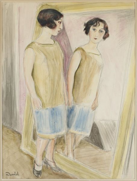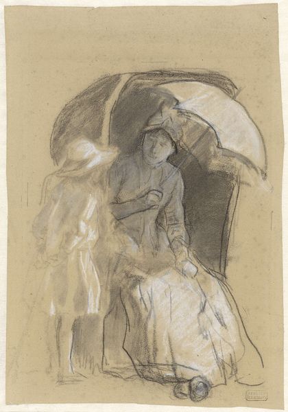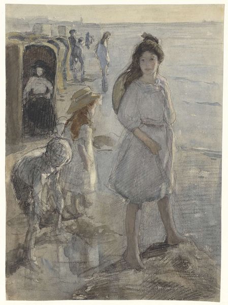 Johan Antonie de Jonge created this artwork titled 'Two paddling girls with large straw hats' with a height of 352 mm and a width of 251 mm. Observe these figures, their large straw hats, emblems of summer leisure, reminiscent of a carefree age. These hats, more than mere protection from the sun, become symbols of a bygone era. Their circular forms echo halos, bestowing a sense of innocence upon these figures, almost lifting them into the realm of the sacred. Consider how the circle of the hat connects to images of sun gods and fertility rituals from ancient cultures, reappearing as halos in Christian art. It's a motif that transcends time, reflecting our collective fascination with light, protection, and the divine. The hat’s function is always shifting, but is always connected to a powerful subconscious connection to our earliest experiences of safety and wonder. The cyclical progression of the motif demonstrates how cultural memory is embedded in our visual language, continually resurfacing, evolving, and imbuing familiar forms with layers of meaning.