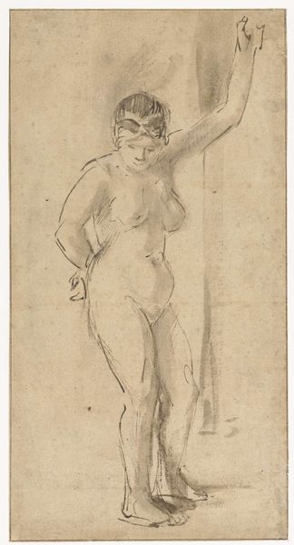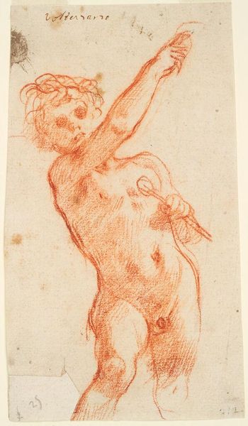 Curator: Look at the joyous energy in Agostino Carracci's "Flying Putto with Arms Raised," a drawing likely from the late 16th century, now held at the Rijksmuseum. Editor: My first impression? Vulnerable. There’s a fleshy, almost awkward quality to the cherub, a departure from idealized Renaissance figures. Curator: It is fascinating how the sketch is not merely about idealized beauty but captures something far more relatable in human or divine form. The "putto," as you see, is a motif deeply ingrained in Renaissance iconography; however, it usually signals divine love, doesn’t it? Editor: Usually. But here, something seems… suspended. Is it ascending, falling, or merely caught mid-flight? That uncertainty shifts the meaning away from the purely celebratory and towards a more liminal, existential state. Perhaps considering socio-political tensions might help understand the purpose and impact of this drawing? Curator: It does offer ambiguity, though, doesn’t it? I believe we are invited to embrace multiple readings of the putto. Consider the raised arms, too, a universal gesture of surrender, praise, or perhaps even seeking rescue. Editor: Exactly! And within the historical context of the late Renaissance, characterized by Counter-Reformation, such ambiguities resonated with anxieties around faith, agency, and the body, questioning the prevailing orthodoxies through the visual language of doubt and supplication. The drawing becomes not merely an aesthetic exercise but a profound statement about the crisis of its time. Curator: A crisis indeed, mirrored in its symbolism and technique! The beauty of it lies in the eye of the beholder; yet this interpretation only enhances the symbolic gravity, offering both artist and audience a glimpse into shifting spiritual landscapes. Editor: Yes, offering today’s viewers an important lens, because this flying figure encourages us to rethink power, hope, and meaning when facing uncertainty. I'd add that his somewhat irregular form and sketched face make him relatable to outsiders, those who feel marginalized even within institutions as supposedly inclusive as religion.