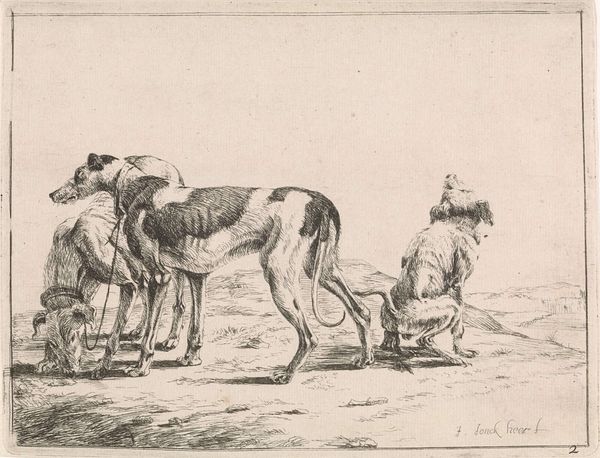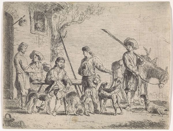 Editor: This is "Herder met geiten," or "Shepherd with Goats," by Anthonie van den Bos, made sometime between 1778 and 1838, using ink on paper. It feels so simple, almost folksy, but there's a real melancholy in the shepherd’s gaze. What do you see in this piece? Curator: I see a potent representation of labor and class. Look at the shepherd’s posture, his worn clothing. How does that contrast, say, with idealized depictions of pastoral life we often see from the same period? Editor: It's much less romantic, definitely more grounded. There’s a sense of… weariness, perhaps? Curator: Exactly. Van den Bos compels us to confront the realities of labor often overlooked in art history. Consider the rise of industrialization during that era. What might this seemingly simple genre scene be saying about the displacement of rural communities? Editor: So, you’re suggesting it's a subtle commentary on the societal shifts occurring at that time? Is the choice of ink on paper important, perhaps indicating something less 'precious' than, say, an oil painting? Curator: Precisely. Ink drawings can often denote immediacy and accessibility. It invites a broader audience to reflect on this subject. Does the lack of color contribute to that feeling of weariness you noticed? Editor: Absolutely, the muted tones reinforce that feeling. It’s a powerful piece when viewed through that lens. Curator: It’s a valuable reminder to always interrogate the societal narratives present – or absent – in art. Editor: I’ll definitely look at pastoral scenes differently from now on! Thanks for highlighting those complex social narratives for me.