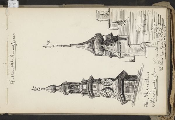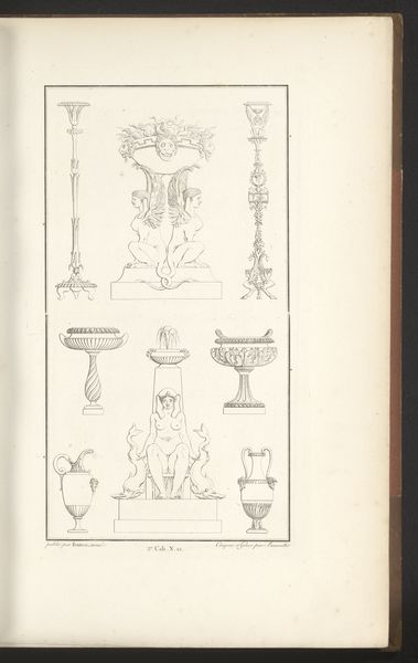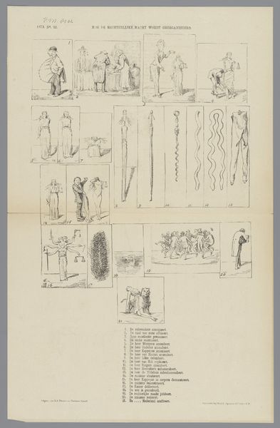 Curator: This engraving from 1873 presents a series of satirical designs. It's titled "Spotprent over de wanstaltige ontwerpen voor een monument voor de Nederlanders gesneuveld bij de Citadel van Antwerpen," which translates to "Cartoon about the monstrous designs for a monument for the Dutch who fell at the Citadel of Antwerp." It comes to us from the hand of Johan Michaël Schmidt Crans. Editor: "Monstrous" is right. The initial impression is almost comical, a wild array of styles colliding in this single sheet. There's a tension between classical elements and the grotesque. Curator: It is fascinating how public monuments became stages for political debate in the 19th century. This print served as visual commentary. Think of how monuments materialize national narratives and historical memory—who gets remembered and how. This print critiques the aesthetic choices, suggesting deeper issues around how the Dutch chose to commemorate their fallen soldiers. Editor: Precisely. There’s also the symbolic language at play here. Observe the figures atop the columns, the various allegorical elements, lions, and obelisks—each carries meaning within a visual vocabulary designed to evoke specific emotions and ideas. Curator: And the architectural forms themselves, drawing on classical and neo-classical traditions, but, as you say, skewed, distorted. It's a purposeful manipulation. Crans' choice of rendering the designs with delicate lines contrasts with the harsh judgment conveyed by the print’s title. Editor: True, that tension really strengthens its message. The precise linework and carefully arranged compositions create a peculiar harmony despite their disparate nature. It elevates what could've been just simple mockery into astute aesthetic critique. Curator: So it prompts us to ask, what makes a monument "good" or "bad"? How does public art shape collective identity, and what happens when those aesthetic choices are contested? Editor: Indeed, what visual strategies shape understanding and even manipulate emotion, whether honoring heroes or skewering aesthetic failings, remains vital to recognize.