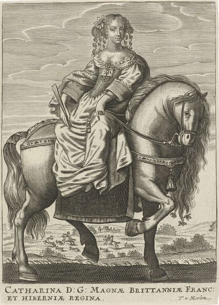 Curator: I'm immediately struck by the controlled power here—the way every line contributes to this stately, almost severe depiction of authority. Editor: Indeed. We’re looking at a print, an engraving actually, of Johann Schweikhard von Kronberg on horseback, made sometime between 1607 and 1637 by Willem de Passe. Curator: The artist's use of line is truly impressive; notice how it defines not only the forms but also seems to imbue the entire scene with a certain restrained energy. I get the impression of cold steel despite it just being a print. Editor: Precisely. Look at the details—the horse’s muscular physique, the elaborate drapery of Johann’s robes. De Passe employs hatching and cross-hatching to create tonal variation, almost photographic despite being an engraving from the Baroque period. It is truly a detailed formalist piece. Curator: It does give you the impression of authority and status! He looks almost as if he doesn't fit within the piece; it's such an impressive and slightly exaggerated piece that he pales slightly in comparison! Do you get that feeling? Editor: It's an interesting point you raise! But no, what is most curious for me is the setting—a city barely suggested, a hint of landscape… It serves merely as a backdrop. This isn't about a man in a place, but rather the idea of a man embodying a symbolic office, as the script beneath attests. Curator: True, the landscape takes a back seat. I love when portraiture makes such a big statement, don't you? To look upon it and instantly, without knowing who he is, understand that this man is powerful. The Baroque loved grandeur and scale, I suppose. It certainly captures that here. Editor: Undeniably! I appreciate the artist's commitment to the stylistic traits, even in this small medium of the engraved metal. The overall effect is an undeniable testament to precision and the cultural ideals of the time. Curator: Indeed, it gives us much to consider about the Baroque style in general. Editor: Exactly! Let's proceed.