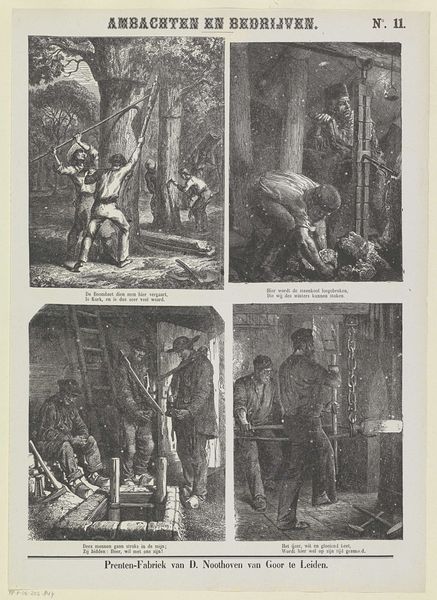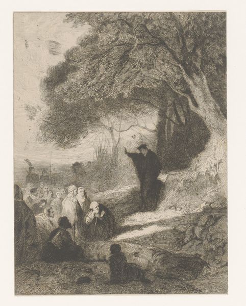 Curator: Here we have Thomas Dalziel’s engraving, "Jacob and the Flocks of Laban—Jacob's Departure from Laban," created sometime between 1865 and 1881. Editor: My immediate reaction is to the sheer industry depicted. You see it in both registers – the hard labor in the upper image and the bustling family exodus in the lower. Curator: Precisely. Dalziel, as part of the "Dalziels' Bible Gallery," aimed to make biblical scenes accessible to a wider audience. It's not just about illustrating the story; it's about reinforcing certain societal values, especially around labor and familial duty, that were prevalent in Victorian England. Editor: And you really get a sense of the Victorian preoccupation with accurate depiction; look at the intense crosshatching employed to render fabric and animal textures, all created through painstaking manual labor. Curator: It speaks to the Victorian interest in realism but also the publishing industry’s influence, mass distribution for instructional purposes with some emotional narrative. The Bible was a social force. These images entered homes, shaping moral and cultural understanding. Editor: And don’t underestimate the material process! This isn’t painting but engraving, it suggests printmaking. You feel how this would have been for circulation: easily reproducible, with those sharp lines designed to hold up to printing presses again and again. The use of this print medium speaks volumes about its intended widespread accessibility. Curator: The dual composition presents interesting juxtapositions, too. Day versus night. Hard outdoor work compared to family life as the lower register almost humanizes the grand narrative. It democratizes the biblical story, aligning with broader social and political currents where the stories become more accessible for people. Editor: I agree. By depicting these familiar biblical events through recognizable, repeatable means, there is an emphasis not on artistic flair but on reliable craftsmanship. These mass reproductions became commodities and cultural values. Curator: Absolutely. "Jacob's Departure" isn't simply about one man's story, it is an accessible biblical reference meant to underscore particular work and familial narratives from both a Victorian and religious point of view. Editor: Looking at the artwork this way makes me appreciate the cultural labor involved, and the broader political influence of material consumption in Victorian society.