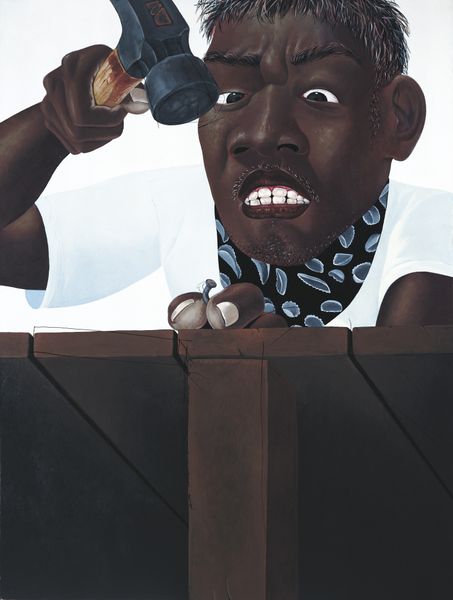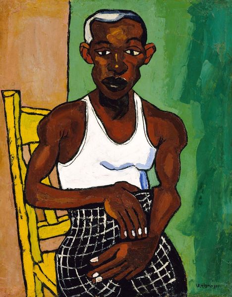 Jammie Holmes made this self-portrait with paint, and a whole lotta soul. Look how the paint isn't trying to trick you into thinking it's real. It's upfront about being paint, about the act of making. I love how Holmes isn't precious with the surface. There's writing, scribbles, ghosts of other ideas peeking through. It's like a mind map, or a visual diary. His legs and arms are rendered with these gorgeous browns, and those stark white boots pop against the checkerboard floor. That running figure on the sign, right next to Holmes's head, looks like it's trying to escape. The face is so direct, the gaze so steady, it pulls you right in. The halo-like form around the figure is almost architectural, like a chair made of light and air. Holmes reminds me of artists like Bob Thompson, who also mixed figuration with abstraction, and wasn't afraid to be raw and vulnerable. Ultimately, this painting is about seeing and being seen, about the stories we carry within ourselves.
