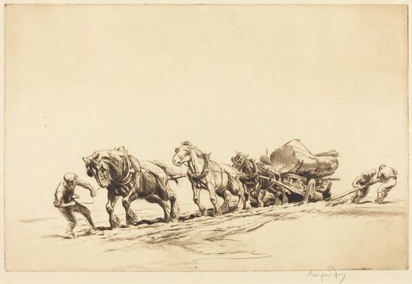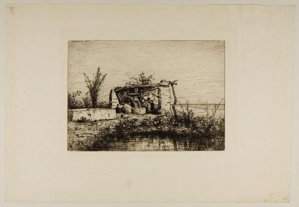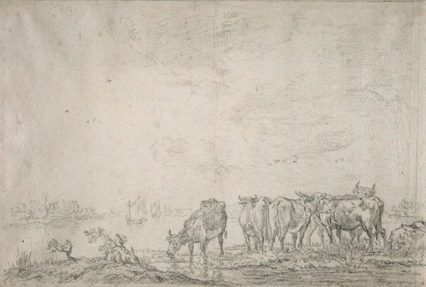 Curator: This diminutive etching, titled "Cowherd," was created by Peter Moran. Editor: It's dreamlike. The muted tones and hazy rendering give it a quality of nostalgia. Curator: Moran's piece evokes pastoral traditions, but it also speaks to the economic realities facing rural populations. The cowherd's solitary figure suggests a marginalization of labor. Editor: Certainly, there's a loneliness implied, yet consider how cattle have symbolized wealth and sustenance across cultures. This image encapsulates a fundamental relationship with the land. Curator: True. And thinking about the cultural context, the absence of distinct racial markers invites questions about whose labor is being visualized and for whose benefit. Editor: The enduring iconography of domestic animals allows for multiple interpretations, personal and collective. The image becomes a vessel for reflecting on our place within nature's cycle. Curator: An important point. It’s fascinating how one little etching can be such a productive space to explore our relationships with the landscape, labor, and each other. Editor: Absolutely. It's these layers of meaning that make encountering art a journey of self-discovery.