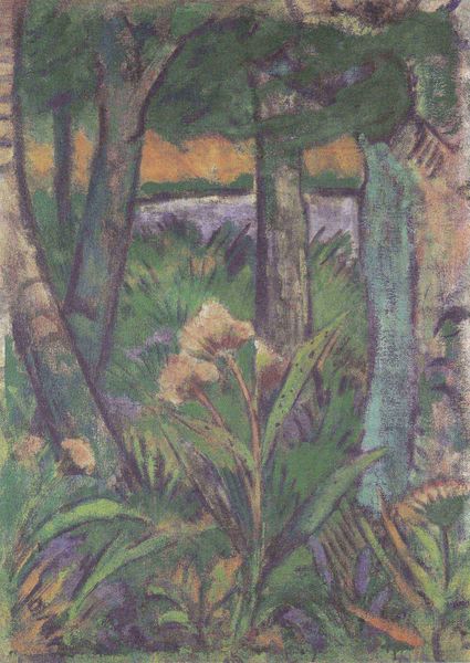 Curator: This is Otto Mueller’s *Landschaft III*, created around 1924. It’s a tempera on canvas and currently resides here at the Folkwang Museum in Essen. Editor: My initial thought? Calm. The muted tones and slightly geometric quality of the trees and foliage give it a sort of peaceful stillness. Curator: It's interesting you pick up on the stillness. Mueller’s work, especially his landscapes, often serve as a bridge between the rapid industrialization of Germany at the time, and a longing for an untouched, more primal world. Tempera paint would’ve been a deliberate choice. It has a matte finish, lending itself to that kind of earthly rawness, compared to something like oil paints, which would yield greater illusion. Editor: Absolutely, that tactile quality underscores the artist's intention, doesn't it? You can almost feel the grain of the canvas, the unmixed pigments of the paint. And consider the labor of the landscape, even. Are we seeing the idealized vision of pastoral escape or something more reflective about the cultural implications of natural resource extraction? The deliberate choice of medium itself comments on the evolving societal perception of the natural world. Curator: Precisely! There is this sense of idealized nature. But to go a bit further on your remark about the socio-cultural elements influencing art creation, one must note the time frame. The Weimar Republic was fraught with political and economic instability. The Expressionist movement itself became almost a form of cultural defiance against those oppressive constraints. The longing expressed through landscape painting takes on political dimensions of escape and even, hope. Editor: And you have this simplification of form… almost abstracted, really. That geometric inclination almost removes any human labor directly from the piece. This absence, in its own way, raises interesting questions about our involvement and exploitation within our landscape. Does this represent control over our natural resources or some inherent loss from distancing ourselves from physical labor? Curator: That's very insightful! This blending of raw materiality and an absence of visible human labor becomes very central to understanding *Landschaft III*, wouldn’t you agree? Editor: I concur entirely. Examining art in this fashion offers compelling glimpses into production, artistry, culture, labor, and even our future, doesn't it? Curator: It truly does.