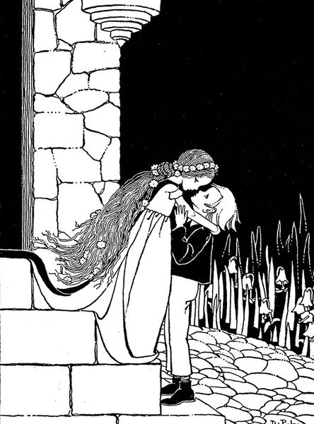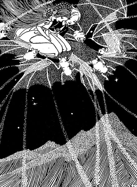Curator: This artwork before us is titled ‘Mopsa The Fairy’ and it was created around 1920, a line drawing by Dorothy Lathrop rendered in ink on paper. Editor: Oh, it has such a beautifully eerie charm, almost like a memory floating up from the depths. It gives me the sensation of gazing into a dream. Curator: Lathrop illustrated many children’s books. Fairy tales and folklore are her usual motifs, blending a gentle style with detailed line-work. Notice how stark and how simple black and white becomes. Editor: Absolutely! And these motifs are heavily imbued with traditional symbol sets, look how they add so much more nuance here. Water imagery abounds - the fairy Mopsa afloat with her companion and dog within a crescent shaped craft whose prow bears a fish like image. And the creatures laboring below the surface... rowing with glowing wands. Curator: There's definitely a submerged world and it reminds me of what's left unspoken. Like a riddle or half remembered childhood song, this world asks you to step back into yourself to access what you innately already knew. Editor: In many cultural stories, crossing water signifies the threshold between worlds. What is fascinating, this drawing renders figures not typically paired or integrated-- fairy, human and dog...what story do they tell traveling together? Curator: It certainly feels like more than a boat ride. In this space between the waking and dreaming, a shared narrative emerges. I am reminded of my childhood walks in forests...this scene evokes a storybook, inviting the viewer in, so one could simply write out the unfolding narrative or allow it to fill your mind. Editor: The stark contrasts—the depth of black ink set against bright white spaces—creates an other-worldly mood and a certain timelessness to it. How are we to discern its hidden meanings? Perhaps the light isn't merely functional but symbolizes revelation... Maybe the creatures are protectors guiding them along their voyage! Curator: And with all those radiant beings below, I cannot help but think it is guiding a journey into one's inner self. Ultimately I think we are gently urged into realms unknown... Editor: Yes, Lathrop gifts us not just a pretty picture, but a quiet and personal prompting for meaning. It allows one to wonder what is carried onward into consciousness!
