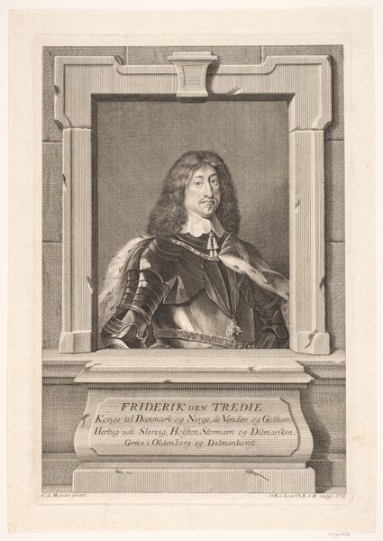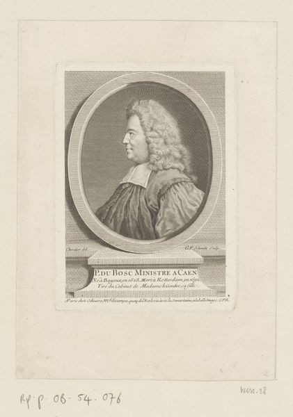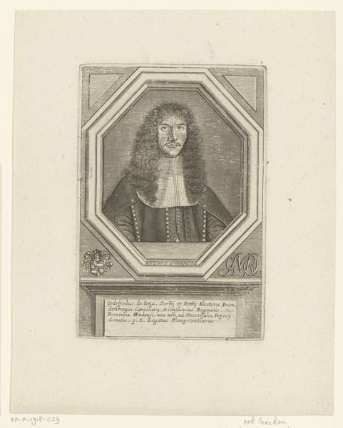 Curator: So, here we have Martial Desbois's 1682 engraving, "Portret van Charles Patin." It offers us a fascinating glimpse into the world of 17th-century academia. Editor: Wow, first impression? A slightly unsettling composure framed by that rather severe oval. Gives the impression of someone both distinguished and, shall we say, permanently disappointed. Curator: It's Baroque portraiture! Such pieces aimed to convey status. Charles Patin, whose likeness we see, was no ordinary figure; he was a prominent physician, a man of science. Prints like these circulated ideas, shaping perceptions of intellectual elites. Editor: Ah, yes, the visual LinkedIn profile of its day! But, I'm also drawn to the meticulous detail...you can almost feel the weight of that voluminous coat. And the delicate hand holding what looks like… some sort of trinket? Curator: That "trinket" might well be a medical instrument or some other symbol denoting his profession, adding another layer of significance for the contemporary viewer. Note, too, the careful inscription that proclaims his credentials: “Carolus Patinus, Eques D.M. Primarius Chirurgia Professor." The artist aimed to embed Patin within a specific socio-intellectual network. Editor: The Baroque era…they sure knew how to make a statement! Is it just me, or does the shading lend a somewhat severe gravity to his gaze? It’s all so purposeful! Curator: Indeed, that air of learned gravitas was intentional. Baroque portraiture aimed not just to reproduce likeness but to project authority, influence, and even virtue, essential qualities in the theatre of power that defined Louis XIV's France. This work allows us to contemplate both individual ambition and broader cultural aspirations of the period. Editor: Considering how portraits can often idealize the subject, it’s like looking into a frozen moment of social aspiration! You know, looking closer at the coat of arms…there's a story hidden there too, no doubt! Each component a little nugget of ancestral pride! Curator: Precisely! And ultimately, the success of portraits such as these resided in their ability to subtly promote an image but also legitimize power relations. It served as a silent advertisement for the man and the society to which he belonged. Editor: And a brilliant snapshot of both personal and societal posturing frozen in time… I can only wonder how he felt about this version of himself being sent out into the world. Thanks for sharing this!
