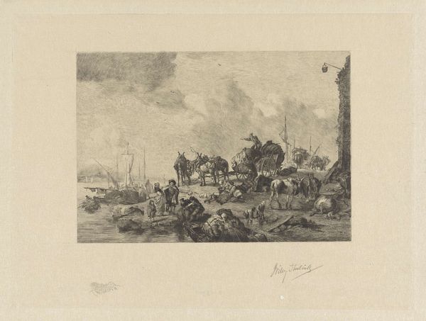 This print, "Overgave van de Citadel van Antwerpen, 1832", was made anonymously, using etching and engraving. These are intaglio processes, meaning that lines are incised into a metal plate, which is then inked and printed. The crisp lines and tonal range we see here result from skilled manipulation of tools. Look closely, and you'll notice the precise lines used to depict the soldiers, horses, and the crumbling citadel. The etcher's labor is evident in the intricate details, conveying a sense of immediacy, depicting a specific historical event. Prints like this one were produced in multiples, for a growing market for images documenting current events. This print is not just a depiction of war, but also a product of a particular moment in the history of image-making, in which traditional craft skills met the demands of mass production and widespread consumption. It blurs the lines between documentation, art, and commodity.