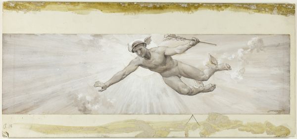 Editor: Will Hicok Low's "On This Side of Jove's Clouds," made in 1885 using charcoal, watercolor, and gouache, depicts a nude figure seated on clouds. It feels very neoclassical in its presentation. How do you interpret this work? Curator: It is vital to consider the materials here, and the social status connected with this set of choices. The artist, making something supposedly ‘timeless’ using easily obtained, commercially available media, questions the entire notion of an ‘artistic genius.’ Someone simply executing a ‘divine’ idea? What ‘divine idea’ can come about without an artistic establishment providing resources, expectations, and access? What ‘eternal’ theme isn’t also thoroughly enmeshed in commodity culture and global trade? Editor: So you are saying that using these media democratizes the artwork and questions established notions? Curator: Precisely! This piece speaks volumes about the changing role of art production during the late 19th century, its departure from traditional elitism through a very embrace of popular techniques of drawing, gouache and watercolour, but ironically using this method to paint the subject in a manner akin to traditional classical imagery. Editor: That's a really fascinating point. I hadn't considered how the choice of materials might reflect a commentary on artistic value itself, and I find the fact it attempts this via traditional figure drawing even more compelling. Thanks for broadening my understanding. Curator: My pleasure, considering art this way helps understand cultural value in a broader context.