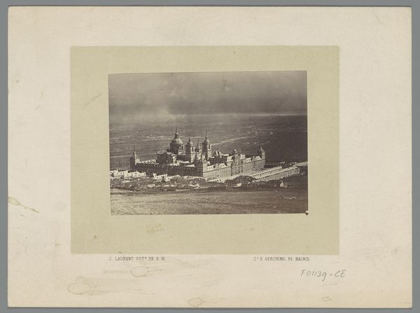 Editor: This gelatin-silver print, taken by C. Huerta sometime between 1860 and 1900, depicts a view of the Escorial near San Lorenzo. The monochrome tones give it a sense of distance and history. What strikes me is its isolation; this imposing building rises starkly from a rather barren landscape. How do you interpret this work? Curator: I see it as a deliberate statement about power and its relationship to the landscape. Consider the historical context: The Escorial was built under Phillip II, a symbol of Spanish imperial authority and Catholic dominance. Placing it so starkly within the landscape, almost devoid of human presence, reinforces that power dynamic. Who is controlling and inhabiting the space in the foreground versus in the monumental site in the background? Editor: So, it's not just a picture of a building, but a comment on the structures and powers it represents. I was also thinking about the medium. Photography at that time was relatively new; would the choice of photography further comment on objectivity? Curator: Precisely. The supposed "objectivity" of the photograph lends a certain authority to the image. It implies an unmediated view of power. However, we need to question that. Who chose this vantage point? What perspective does it privilege? Early photography often served colonial and imperial agendas. Editor: So even in what appears to be a simple landscape, there’s a whole story being told about power, perspective, and representation through this very modern technology. Curator: Exactly! And by analyzing these layers, we can begin to unpack the complex social and political forces at play in 19th-century Spain, as well as who occupied the open land between the viewer and this important site of power. Editor: I never would have considered it from this lens at first glance. Thanks, this was really eye-opening!