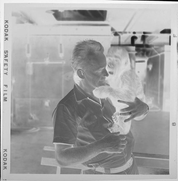 Curator: Here we have an untitled work by Jack Gould, depicting a man holding a baby chimpanzee. The dimensions are quite intimate, only 6 x 6 cm. Editor: It's haunting, this small photographic negative. The inversion of light and shadow, with the stark white figures against the darker background, lends an ethereal quality. Curator: It's interesting to consider the labor involved, even in such a small format. The photographic process itself, the materials used - the film, the chemicals - all contribute to its existence as a physical object. And what of the labor to care for the animals involved in this image? Editor: Absolutely. And the chimpanzee, cradled in the man's arms, becomes an almost Christ-like figure, a symbol of innocence and vulnerability. The reversal of values heightens that sense. Curator: It forces us to consider the social context, the history of humans and primates, our relationship to animals, and the means by which images like this are created and consumed. Editor: It's a potent image that lingers, despite its diminutive size. One to contemplate long after one has moved on. Curator: Indeed, a piece that invites reflection on the many hands involved.