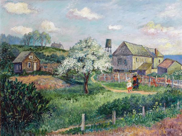 Curator: My eyes feel sun-drenched just looking at it. Is it me, or does this feel like a perfectly captured fleeting moment? Editor: That's the magic of Impressionism! This is "Le Châlet De Blanche Pierson à Pourville," painted in 1882 by Pierre-Auguste Renoir. You can practically smell the sea air coming off this oil painting. Curator: Definitely get the sea air. I love the feeling of gentle disorder – that the landscape just sort of happened, with the little village nestled in. It almost vibrates with light and spontaneity. Like he just tossed it all together. What exactly is a "châlet?" Editor: A châlet is like a Swiss cottage or a summer house, right? Pierson, an actress, owned that house in Pourville, France, and the painting does a great job in showing a bourgeois community taking retreat from the city during summer, relaxing away from urban centers, amid fresh and untouched nature. The way the houses huddle together, it’s a little bit of society in retreat. Curator: Exactly. The details, especially those little figures on horseback down below, it's all so soft and playful, but even with such vivid color and lively brushstrokes, it has something about it... Almost wistful, don't you think? The colours are somehow making me sleepy... Editor: That wistfulness you are experiencing probably ties into a shift in Renoir's style at the time. "Le Châlet De Blanche Pierson à Pourville" comes at a time when Renoir, like other impressionists, grappled with the changing landscape of art— how much to embrace the fleeting moment versus something more permanent. It is an exercise in light, but also a deeper quest to capture a modern experience. Curator: Modern indeed, this landscape also makes me think that it is actually timeless. Editor: I’d agree. It invites a slower, more thoughtful viewing. It's a scene that reminds you that there's a long cultural history of art's relation to place.