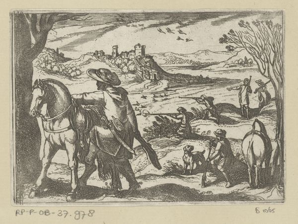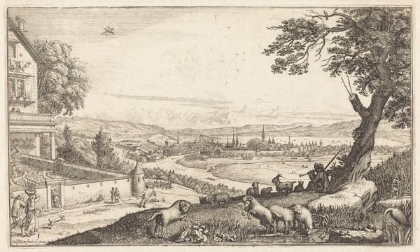 Editor: Here we have "Landschap met vee," or "Landscape with Cattle," an etching by Battista Angolo del Moro, dating from 1550 to 1573. It’s a busy scene, with so many different things happening! What do you see in this piece? Curator: It is teeming with cultural memory, isn't it? Consider the landscape itself. The pastoral scene, rendered with such detail, immediately evokes a sense of Arcadian simplicity, a visual trope with roots stretching back to classical literature. The animals represent something about plenty and also being yoked, think of our relationship with animals over the long haul. How does the distant cityscape contrast with this immediate foreground? Editor: I hadn't thought of the "Arcadian simplicity" before, that's a neat link! It does seem idealized, but the city is also quite small. Maybe it's meant to represent what society depends on: the town needs the cattle and dairy products from the countryside in order to thrive. Curator: Precisely! And consider the figures populating this landscape. Their clothing and activities echo societal values and relationships of that time. Are they simply tending to the cattle, or might their gestures also tell us about familial connections or the role of humans within this cultivated space? What are they trying to communicate about an economy or a social role? Editor: Oh, it's interesting that you focus on the people in that way. So their position or clothes might actually hint to specific social standing? I wonder how the presence of that boat over on the far right informs the cultural story… Curator: Exactly. See how the image creates this layering effect that can both celebrate human activity while contrasting that activity to civilization. Even in what appears to be mere scene-setting, can you decode signs of historical values and belief systems that help explain how the people relate to that time and what its collective memory really means? Editor: That's really fascinating. It's made me rethink how seemingly straightforward landscape scenes can be, when you consider symbolism and context. Curator: Absolutely. Next time you see a work, look beyond the surface. What story is it telling and what memory is it preserving?