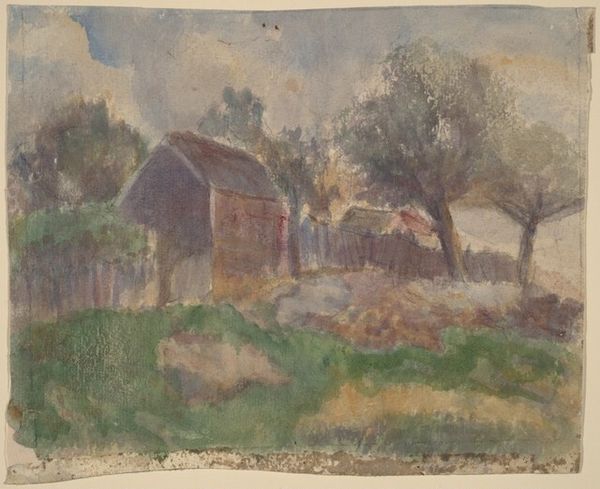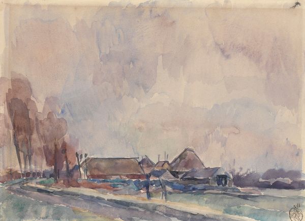 Curator: We're looking at \u013dudov\u00edt \u010cord\u00e1k's "By the Water," a work likely completed between 1920 and 1925. Editor: It strikes me immediately as muted, restful, almost dreamlike. The colors are soft, predominantly earthy tones, and the forms seem gently blurred. Curator: Indeed, the artist’s choice of watercolor aligns with this Post-Impressionist painting style. The era saw art increasingly used to reflect subjective emotions and the modern experience. Think about how industrialization and urbanization were changing daily life and one might expect people were longing for the slower pace depicted here. Editor: And there's a quiet domesticity present in the architecture and the figures resting near the water's edge, which brings up some interesting points about material needs and labor of leisure, and how certain types of leisure become fetishized across history. Were the people near the river workers taking a pause or those for whom this slower pace of life was permanently available? Curator: Precisely, thinking through those elements in conjunction with a Post-Impressionist lens gives us a deeper insight into the narratives this piece subtly evokes about class and labor. Considering also that watercolor allowed \u010cord\u00e1k to engage the “en plein air” method gives way for further intersectional interpretations about gender in art creation. This connects the work to contemporary debates around materiality. Editor: "En plein air" gives it this sense of immediacy, as though capturing a fleeting moment, despite the deeper societal structures implicitly on display. Watercolors allowed many artists easier access, and it’s a testament to \u010cord\u00e1k's ability to construct a view with an acute sensitivity. The surface appears textured, almost aged, enhancing the feeling of history. Curator: It encourages a conversation, doesn't it, about the romanticism often attached to landscape art? Looking closer at what is depicted, its composition, and how that engages in cultural identity, one can really start unpacking broader discussions of place and identity. Editor: Ultimately, for me, the appeal lies in its understated quality, how much is left unsaid but somehow communicated through those brushstrokes and subtle hues. It is what speaks most. Curator: I think that speaks to the enduring relevance of understanding both the artist's method, and what the work suggests. By viewing artwork, it gives viewers opportunities to reflect on intersectional dialogues.