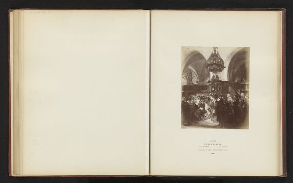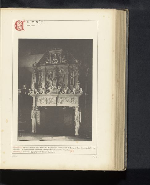 Editor: This is a photograph of the fireplace in Kampen’s Town Hall, dating from before 1894. It's from the Rijksmuseum collection, taken by an anonymous artist. It's incredibly detailed, almost overwhelmingly so. What do you make of it? Curator: The photograph, focusing as it does on line, form, and the tonal range from light to dark, emphasizes the structure and sculptural qualities of the fireplace itself. Notice the geometric shapes--the rectangles, the squares, the curves--and how they interact. Editor: I do see that contrast. But what about all the tiny figures? Curator: They are part of the overall composition, certainly. They create a visual texture. What is important to me as a formalist are the relationships between the elements: how the lines direct the eye, how the shapes interact to create balance or tension. Editor: I see. So, the figures aren’t important on their own, it is how they fill the shape they're in that interests you. Curator: Precisely. And consider the use of light and shadow. How does the photographer utilize these to define the architectural forms and draw our attention to certain areas of the fireplace? What impact does it have? Editor: The shadows definitely add depth and bring out all of the tiny carvings on the stone, but at the same time create areas I struggle to make out properly. Curator: Indeed. A question of clarity and obscurity. Formally, how does the interplay create dynamism? It is also essential to ask: what does this piece tell us about the nature of photography itself as a means of capturing and interpreting three-dimensional space? Editor: This way of thinking really pulls you into the shapes and relationships within the image, but I am still thinking about the subject and history depicted in those shapes. Curator: Perhaps this tension, between form and content, is precisely where the artwork’s power resides.