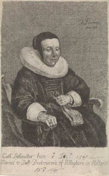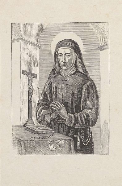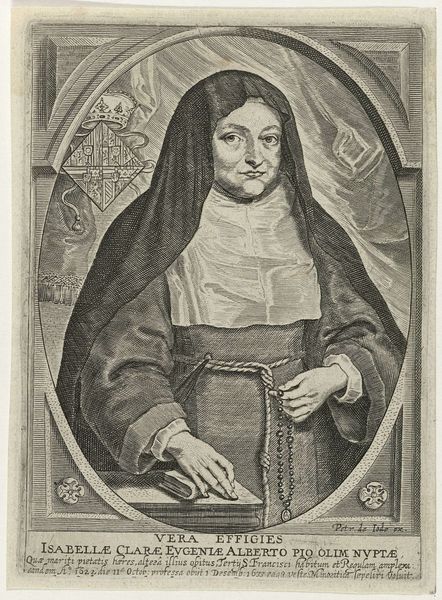 Curator: This engraving, held in the Rijksmuseum collection, offers a portrait of Isabella Clara Eugenia. Though the piece is dated 1604-1670, historical context is critical here, because those dates suggest the print was made during her lifetime or shortly after her death, given her governance of the Spanish Netherlands from 1598 until her death in 1633. It’s after a work by Peter Paul Rubens and engraved by Crispijn van de Passe the Younger. Editor: Well, my first impression is… somber. The stark lines of the engraving really bring out a sense of seriousness, almost a heaviness. The textures, though—the delicate folds of her veil, the pattern behind her—it’s incredible how they capture such detail! But still, there’s something very imposing about her gaze. Curator: Absolutely. The gravitas is intended; her position demanded it. Notice how the engraver contrasts her simple habit with the heraldic shield in the upper left corner. It's about visually communicating power within both the secular and spiritual realms, and we mustn't forget the crucial role of prints in disseminating her image across Europe, carefully projecting Spanish authority. Editor: You can feel it in the very lines of the thing. The cross-hatching used to build the dark shades behind her feels weighty, almost like an oppressive blanket of responsibility settling onto her shoulders. And yet… the almost hidden monogram of "IHS" to the right. A constant reminder of faith? That makes it interesting, as she’s seemingly weighed down, yet anchored. Curator: Indeed, and it shows a brilliant synthesis of religious imagery and secular governance. Consider, too, the strategic advantage she cultivated through patronage of the arts, including having her likeness widely distributed. Prints like these became tools of diplomacy and image control. It served not only as documentation but also to construct and reinforce dynastic power. Editor: Makes you wonder about the true Isabella behind the regal facade! Like, what did she dream about? What silly songs got stuck in her head? History sometimes forgets the beating heart. Curator: Very true, while it’s important to engage our imagination, it’s worth remembering these formal portraits were hardly candid snaps; these kinds of depictions of individuals such as Isabella tell us more about the politics and values of her status rather than any real ‘personality’. Editor: Still, even in its constructed formality, the piece resonates. It makes me consider all the Isabellas lost to history, women of power who juggled faith and their authority. This experience also teaches me not to jump to a ‘first’ impression, which can be a poor interpretation!