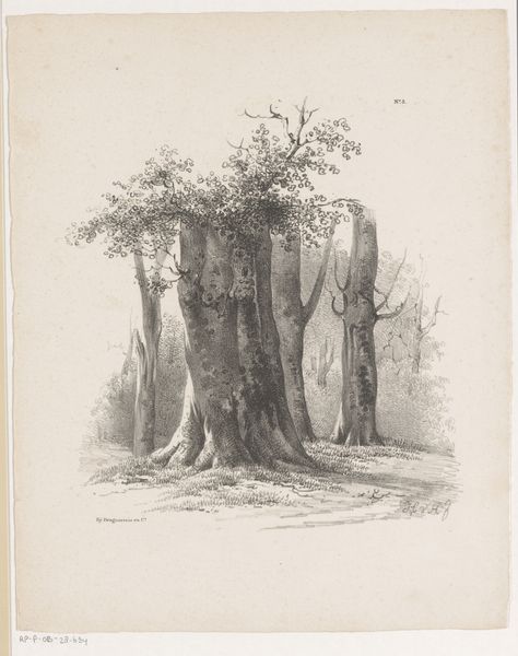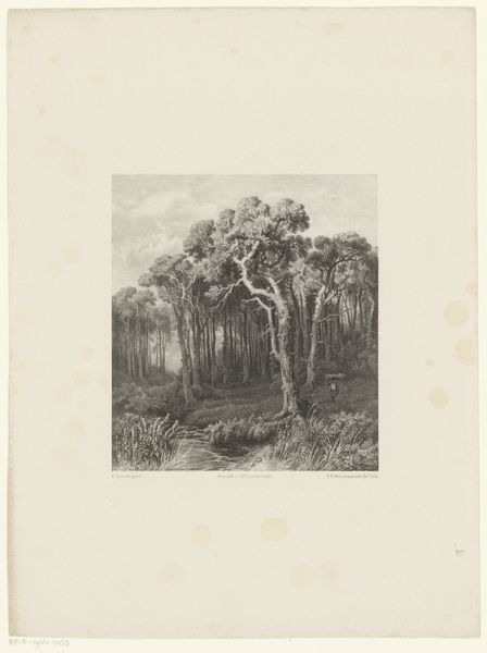 Barend Cornelis Koekkoek made this drawing, Bosgezicht, with pen in grey ink and brush in grey and brown, sometime in the first half of the 19th century. Koekkoek specialized in idealized landscapes, and this forest scene reflects a broader cultural interest in nature during the Romantic era. His highly detailed and carefully composed images, as seen here, appealed to the values of the rising middle class in the Netherlands. These landscapes weren't just about pretty scenery; they represented a sense of national pride and connection to the land, especially significant after the Napoleonic era. The presence of the bench is telling of the emerging culture of leisure and the way that institutions of the time were starting to think about art as a way of promoting both moral and physical wellbeing in a rapidly changing society. To fully appreciate Koekkoek's work, consider the historical context and the market for landscape paintings at the time. Art historians consult exhibition records, collectors’ archives, and period publications to better understand the artwork's original reception and its place within the art market. The meaning of art is always shaped by social context.