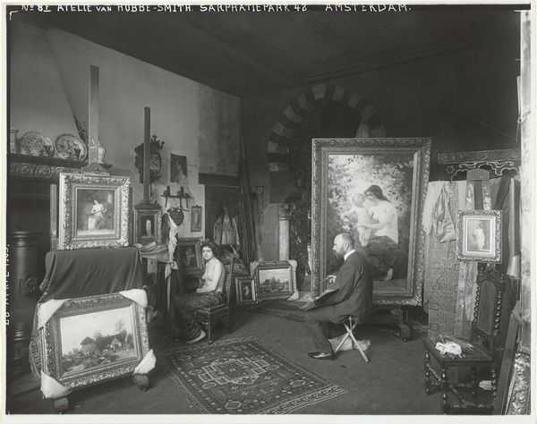 Curator: This photograph, taken after 1917, depicts the painter J.S.H. Kever in his studio at Oosterpark 87 in Amsterdam. It's quite a captivating scene. Editor: It has a very self-aware quality. Almost theatrical, as if staged. The textures – the rugs, the canvases, even Kever's suit – all seem deliberately arranged. Curator: Indeed. The composition leads our eye around the room, emphasizing the tools of artistic creation and Kever's position amidst his works. We observe the process and its fruits concurrently. Note how the paintings create multiple planes within the two-dimensional photographic frame, a layering that enhances the space. Editor: And I can’t help but notice the sheer amount of artistic labor present. The framed paintings propped everywhere, canvases stacked and leaned—it’s a physical representation of the means of production. You see not just finished artworks, but the material residue of creation itself. Curator: Precisely. The artist becomes both subject and object; the artwork a means of showing labor. His figure is positioned in the foreground and almost blends in. Editor: But beyond the technical skill, there’s also a kind of intimate, human story embedded in all this materiality. These tools and paintings testify to the artist's long, productive career; a testament to lived labor. You also get a feel of this place of inspiration, right in his own atelier, this image transmits it right away! Curator: It’s also a study in artistic legacy, wouldn’t you agree? The image is now a piece of archive photography, recording what was considered the everyday. But the subject of the picture will last throughout history. Editor: Yes, and by showing all this together the image captures so much of his career within a single photographic frame. A life dedicated to art. Curator: It gives us cause to consider the processes of creativity, materials, and how an artist leaves a tangible mark, something you clearly love about the image. Thank you for your reflections! Editor: Thank you for this insightful dialogue! It's inspiring to contemplate art and the labor and impact of what the artist creates and provides to society.