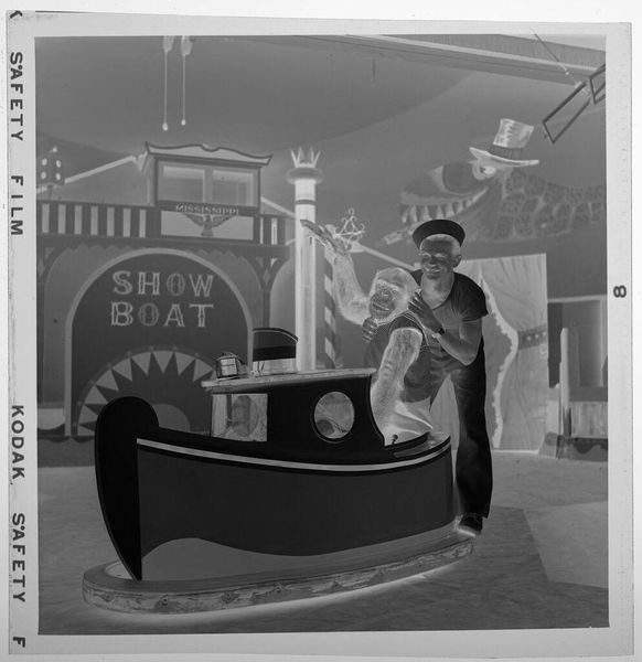 Curator: This is an untitled photograph by Jack Gould, currently held at the Harvard Art Museums. It features a man and chimpanzee posing on what appears to be a prop tugboat. Editor: It feels like a strange dream. The textures—the fake boat, the man's uniform, the chimp's fur—everything seems constructed and staged, yet deeply human. Curator: Absolutely. The material reality of the scene clashes wonderfully with the aspirational image they're trying to create. The backdrop hints at a "Show Boat" with the Mississippi, invoking romantic fantasies of river travel. Editor: It's unsettling how the artifice of the setting and the chimp’s staged pose point to the constructed nature of spectacle. I find myself thinking about the labor involved in creating and maintaining these illusions. Curator: It's a striking image that encapsulates our complex relationship with artifice and authenticity, don't you think? Editor: I agree. I’m left wondering about the stories behind the photograph—who these figures were and what narratives they were trying to perform.