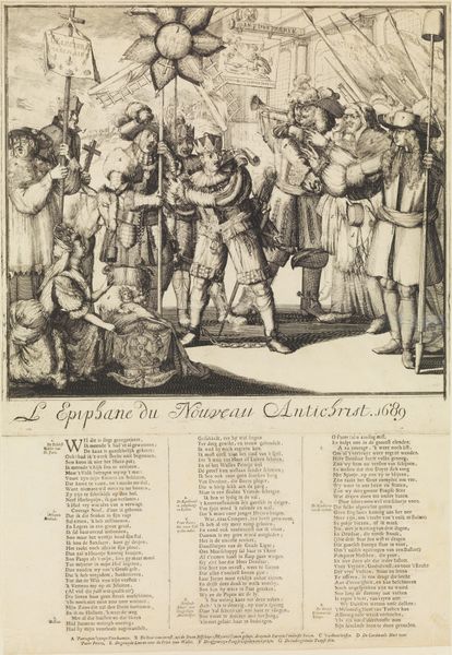 This etching, "Spotprent op Lodewijk XIV en de dauphin," was made by Romeyn de Hooghe in 1689, using a process that allowed for the relatively quick reproduction of images on paper. Consider the material impact of etching, this technique allowed artists to disseminate their ideas widely, engaging with contemporary social and political issues. The fine lines and details you see are achieved by drawing into a wax-coated metal plate, which is then submerged in acid to bite away the exposed lines, and finally inked and printed. In this work, de Hooghe uses the print medium to offer a satirical commentary on Louis XIV, critiquing his political ambitions. The choice of etching is significant here, as it enabled the artist to reach a broad audience with a critical message, reflecting the growing power of public opinion in the late 17th century. The work involved in creating such prints reflects both artistic skill and the mechanics of production, blurring the lines between craftsmanship and mass communication. Ultimately, this etching serves as a reminder of how materials and making processes can shape and amplify social commentary, challenging traditional distinctions between art and craft.