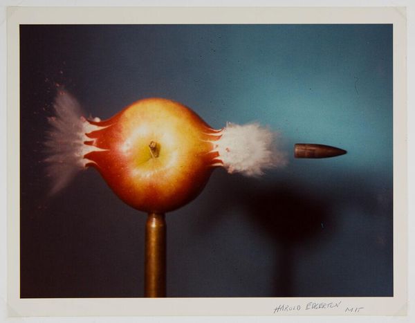 Editor: This photograph, "Bullet through Banana," by Harold Edgerton captures a fleeting moment with incredible detail. It feels almost violent, yet strangely scientific. What does this image communicate to you? Curator: Edgerton's work transcends mere scientific documentation. Consider the cultural context: mid-20th century, burgeoning fascination with technology, and a sense of mastering the unseen. Isn't there a playfulness too, a kind of subversion of power through this ephemeral act? It suggests a commentary on the spectacle of destruction. Editor: That's a fascinating point! I hadn't considered the cultural implications beyond the technology itself. Curator: Indeed, the visual impact is immediate, but its lasting resonance lies in how it reflects society’s complex relationship with technology and power. Editor: I appreciate that new perspective; it adds layers of meaning that I hadn't initially grasped. Thanks!