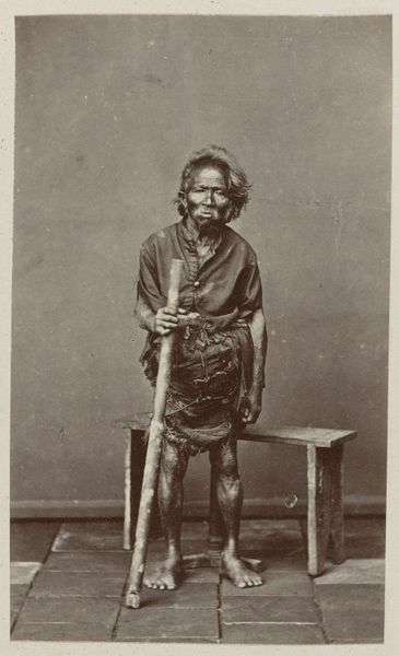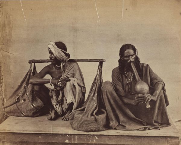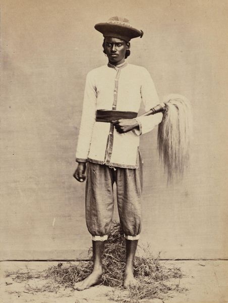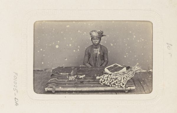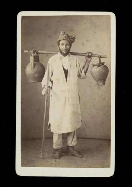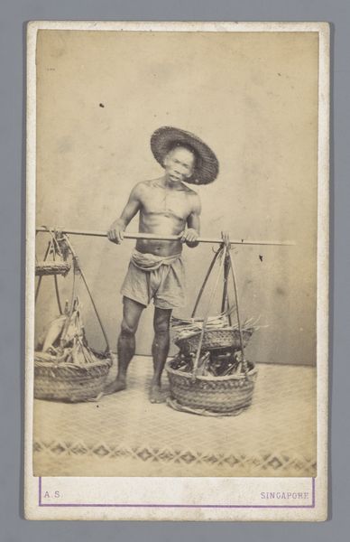 This photograph, "Javaanse drager met planten", was created by Woodbury & Page. Its composition immediately draws the eye to a balanced yet complex arrangement. The symmetrical distribution of the plants and the central positioning of the carrier create a structured visual field. The tonality, a spectrum of sepia, functions to both unify the varied textures—the lush foliage, the woven baskets, the man’s clothing—and to highlight their contrasts. The artist uses line and form to intersect with colonial narratives of the time. The structure and arrangement might prompt a broader dialogue on the act of representation and the cultural codes embedded within ethnographic photography. Note the strategic use of light and shadow. This photograph functions not just as a visual document but as a cultural artifact that invites ongoing inquiry.