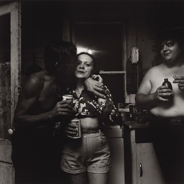 Curator: Larry Fink's black and white photograph, titled Benefit, The Museum of Modern Art, New York City, captures a scene of social interaction. Editor: It feels intimate, voyeuristic almost. The stark contrast enhances the raw, unpolished feel. Curator: Fink often employed a wide aperture and direct flash. Note how this flattens the space, pushing the foreground and background into a disconcerting proximity. Editor: This approach invites analysis of power dynamics, class distinctions, and gender roles within the seemingly glamorous setting, and to see how race and wealth intertwine. Curator: The composition emphasizes the geometry in the backdrop, disrupting the flow of the image and adding another layer of visual complexity. Editor: Ultimately, the image reflects not just a party, but a larger commentary on society, privilege, and the act of observation itself. Curator: A fascinating interplay of form and content.