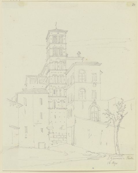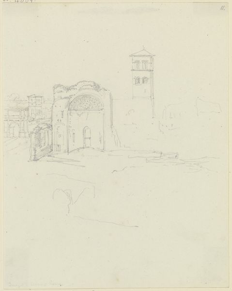 Curator: Here we have Friedrich Maximilian Hessemer's pencil drawing, "Santa Pudenziana in Rome," sketched in 1828. Editor: Immediately, I feel this hushed reverence, you know? Like stepping into a sun-drenched courtyard, pencil lines almost whispering the architectural details. Curator: Hessemer, entrenched in the Neoclassical movement, found himself in Rome, captivated like so many Northern European artists before him. This work reflects a common trend—rendering ancient or important architecture to bring attention to Rome’s central importance in history. Editor: I like the contrast. The sketchiness is juxtaposed against this very permanent-looking building, and it’s really a reminder that even stone fades, even history shifts under our feet, or, in this case, pencil. Curator: The Basilica of Santa Pudenziana, one of the oldest churches in Rome, held profound symbolic significance, being associated with early Christian history. Hessemer, like his contemporaries, used such imagery to engage with a dialogue about faith, history, and cultural heritage. This was the moment, of course, when the Papal States began really engaging with preservation of historical sites. Editor: Right, like Rome wasn't just some antique pile of ruins but something breathing. Curator: Precisely. The basilica wasn't merely a building but a symbol ripe with meaning that spoke to a particular social and political climate eager to reclaim and reimagine its connection to antiquity. Editor: So it becomes this powerful icon, rebuilt through the ages, rendered here with just the right amount of light and shadow, suggesting both weight and ethereality. To me, this isn't just a depiction of a basilica; it's about memory and how we rebuild the past through art. Curator: Absolutely, it invites us to reflect on the layers of history, on how institutions build upon the old to fashion the new. Editor: A delicate and ephemeral yet deeply impactful reminder of Rome’s endurance through Hessemer’s eyes. Curator: Indeed. The past reimagined.