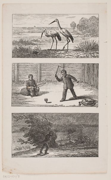 This is 'September' from the 'Album of Rustic Subjects,' created by Charles Jacque. The division of labor depicted reminds us of classical calendars, where each month is depicted with human figures performing agricultural tasks appropriate to the season. Here, in three vignettes, we observe sowing, hunting, and harvesting, activities deeply rooted in the cycle of life. Sowing, the act of scattering seeds, links us to ancient fertility rituals, seen in Egyptian art and the cult of Demeter. This contrasts with the hunting scene, where man asserts his dominance over nature—a theme explored by artists like Courbet, questioning our relationship with the wild. The harvest, heavy with fruit, is an age-old symbol of plenty, echoed in countless harvest festivals throughout history. Consider the psychological undercurrent: man’s persistent need to control nature’s bounty, a drama that plays out in the field, but also in our collective memory. We subconsciously seek to dominate and control, yet are reminded of our dependence on natural cycles.