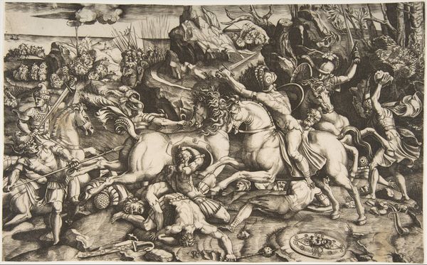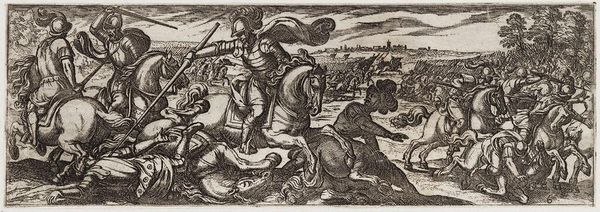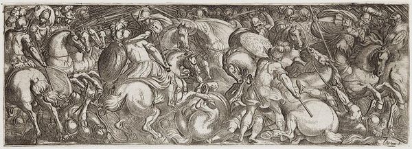 Curator: This is "Cavalry Engagement at Close Quarters," by Antonio Tempesta, an Italian artist who lived from 1555 to 1630. It's quite a whirlwind of action. Editor: It’s so intense! The way the figures are packed together, it’s almost claustrophobic. The horses are rearing, soldiers are falling… it feels like chaos. Curator: Tempesta was known for these dynamic battle scenes. He really captures the ferocity and brutality of conflict. It is, after all, a depiction of power and violence. Editor: Absolutely. And the composition emphasizes that. The tight cropping focuses our attention on the immediate struggle, obscuring any larger strategic context. Curator: Right. It's a perspective that brings us into the heart of the fray. Editor: It makes you wonder about the stories left untold, the human cost of these clashes. Curator: Indeed. It's a reminder that behind every grand historical narrative, there are countless individual experiences of suffering and loss. Editor: And that's something to keep in mind when we view historical art—the silences as well as the spectacle.