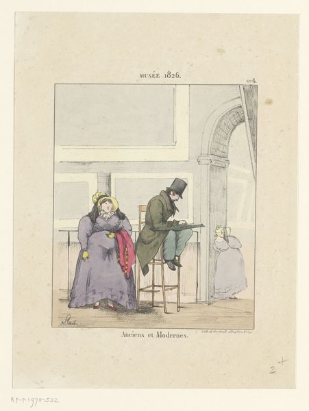Curator: Here we have Frédéric Bouchot’s “Caricature of a Member of the National Guard by the Hearth,” created between 1835 and 1837. It’s currently housed right here at the Rijksmuseum. Editor: My first impression is that it’s a fascinating study in discomfort, rendered with incredibly delicate lines. The man's posture, the harsh light – everything screams tension. Curator: Absolutely. It's a genre-painting rendered as a caricature. Notice how the artist uses specific details—the disheveled uniform, the roaring fire juxtaposed against the man’s apparent chills—to hint at a deeper narrative of post-duty exhaustion and disillusionment. There’s social commentary embedded in this intimate scene. Editor: The use of color is subtle yet strategic. The somber hues of the room contrast sharply with the bright, almost mocking light reflecting off the mantle. It pulls our eye right to that point of... emptiness? Is he seeking solace, or is it amplifying his unease? Curator: Precisely. The hearth symbolizes domesticity and warmth, yet the guard is physically and emotionally distanced. He’s failing to find the expected comfort. This tension reflects broader anxieties within the rising middle class and their roles in post-revolutionary France. He’s wearing his guard uniform indoors and seems to be on edge about something. Editor: And what of the woman in the background? Her presence is subdued. Is she concerned, or simply resigned? Curator: I think her ambivalent expression is crucial. She represents a domestic sphere that perhaps doesn’t understand or isn’t affected by the guard’s struggles. It underscores the psychological distance between the public duty and private life. This also ties in Romanticism that touches on humanism. Editor: Looking at the composition as a whole, I’m struck by how the vertical lines – the rifle, the doorway, the fireplace – box him in. It contributes to this feeling of entrapment. It almost feels claustrophobic. Curator: Yes, the artwork definitely draws the viewer in to ponder the psychological space between patriotic fervor and personal weariness. It's far more profound than it seems at first glance. Editor: I agree. Bouchot certainly invites us to question the idealized image of duty and its real human cost.