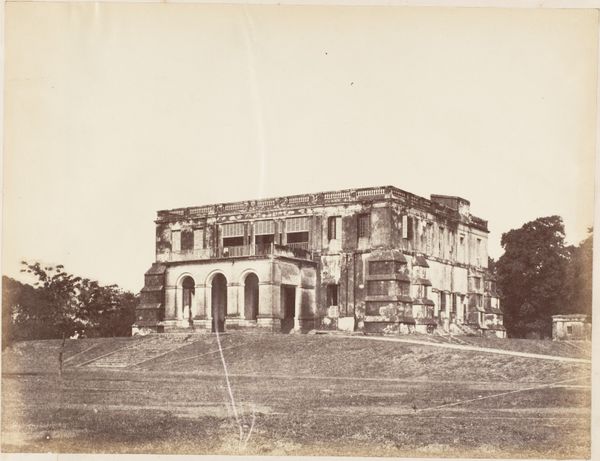 Curator: Looking at this print of Tintern Abbey by Francis Bedford, made sometime between 1860 and 1894, what immediately comes to mind for you? Editor: It's evocative, almost ghostly. The ruins stand proud, yet they're clearly surrendering to nature. A very romantic image. Curator: Indeed. Bedford, a prominent photographer of his time, skillfully captured this medieval ruin within a landscape. He used the albumen print method, lending this photograph a sepia tonality. Editor: That tone definitely adds to its atmosphere. The Abbey is placed within a wider cultural context: think of Romantic poets like Wordsworth who were drawn to such landscapes and ruins as emblems of a bygone era. The picture’s appeal is enhanced by that literary association. Curator: Precisely. The ruins themselves speak volumes, beyond aesthetics. Tintern Abbey was dissolved in 1536 during Henry VIII’s Dissolution of the Monasteries. This was a turning point, shifting the religious and social landscape of England forever. What meanings and symbolism are evident to you? Editor: Decay, inevitably. But I also see resilience. Even in ruin, the Abbey retains its imposing presence, a symbol of the Church's enduring impact even after its physical dismantling by the state. The climbing plants seem to want to cover up the loss that this once-active place of worship signifies. It seems that they have, since time itself, almost reverentially adorned what’s left of it. Curator: That is something that should be pondered on further. I think this piece helps us consider how architectural photography of ruins not only preserves historical imagery, but it actively participates in creating our understanding of history. We’re witnessing Bedford's 19th-century lens shaping our present perceptions of medieval history, as we can feel the echoes of its sociopolitical past, reverberating within us. Editor: Absolutely, photography does more than merely record, doesn't it? This image encapsulates so much of our understanding of romanticism and even social power dynamics of British history.