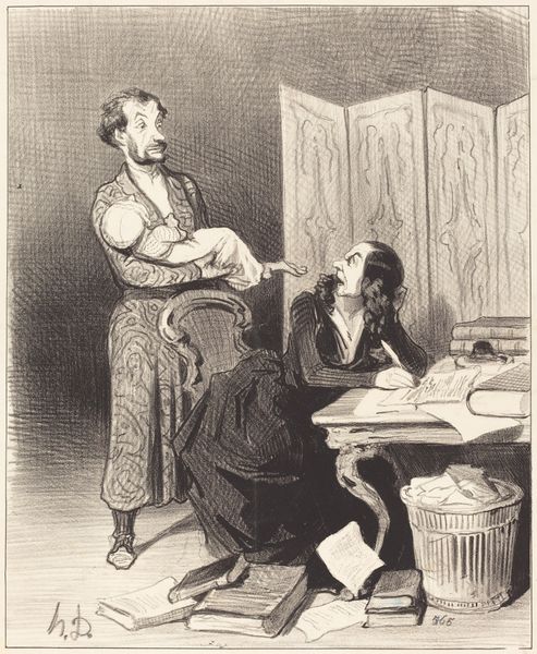 Honoré Daumier made this lithograph titled "Décidément nous nous amusons trop, Guillochard!..." during a time of significant social and political change in France. Daumier critiques the bourgeoisie, here represented by two men in military uniforms, reveling in excess while seemingly detached from the world around them. He held strong republican beliefs and frequently satirized the political figures and social customs of his time. His art often served as a form of social commentary, reflecting his personal experiences and beliefs. The title, which translates to "Indeed, we are enjoying ourselves too much, Guillochard!", adds a layer of irony, emphasizing the disconnect between their privileged existence and the struggles of the working class. The scene evokes a sense of discomfort, as we witness their indifference and self-absorption. Daumier's lithograph doesn't just reflect societal issues but challenges us to confront the complexities of class, power, and social responsibility, inviting us to reflect on the emotional and personal dimensions of social inequality.