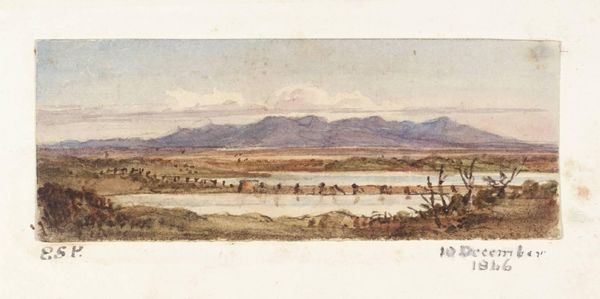 Editor: Welcome. Before us hangs Henri-Joseph Harpignies’ “Landschap met een rivierdal in Zuid Frankrijk,” painted in 1861, housed here at the Rijksmuseum. Curator: My first impression is one of sublime tranquility, largely achieved through a mastery of tonal variation and composition. The muted palette evokes a calm stillness, a pause in time. Editor: It’s interesting you mention stillness. What strikes me is the sense of labor embedded in this landscape. While rendered with delicate watercolors, we see hints of human presence modifying the landscape for agriculture and transportation, impacting its material reality. Curator: Indeed, the materiality of paint serves a key function, mediating the space. Harpignies uses layers of diluted pigments to construct depth and aerial perspective. The visible brushstrokes and delicate washes grant the scenery a light, airy quality. This isn’t mere topography; it's carefully composed atmosphere. Editor: I agree. Consider how the artist uses the watercolor medium itself—its inherent fluidity and translucence—to depict the shimmering river. The execution makes visible how resources of land, people and art materials form landscape's character. The act of painting becomes almost as central as the scene it represents. Curator: Quite. We can consider how Harpignies guides our eyes from the darker foreground to the lighter, blurred mountains on the horizon. He establishes an ideal aesthetic plane, relying on semiotic codes of pictorial composition to present a very deliberately "harmonious" scene. Editor: And perhaps that "harmony" obscures, intentionally or not, the continuous act of labor involved in shaping the South of France as we see it. From planting and building, a whole economy makes such beauty possible. Curator: That friction between artistic representation and social implications presents a rich lens through which to examine landscape painting in that time. It is a piece to which formalism offers a key, while materialism throws open the whole door to consider the world that produced such painting. Editor: Very well said. Considering all we've noticed together, I look at the painting with renewed awareness. Curator: I find myself equally compelled to re-evaluate its depths. Let's move on, shall we?